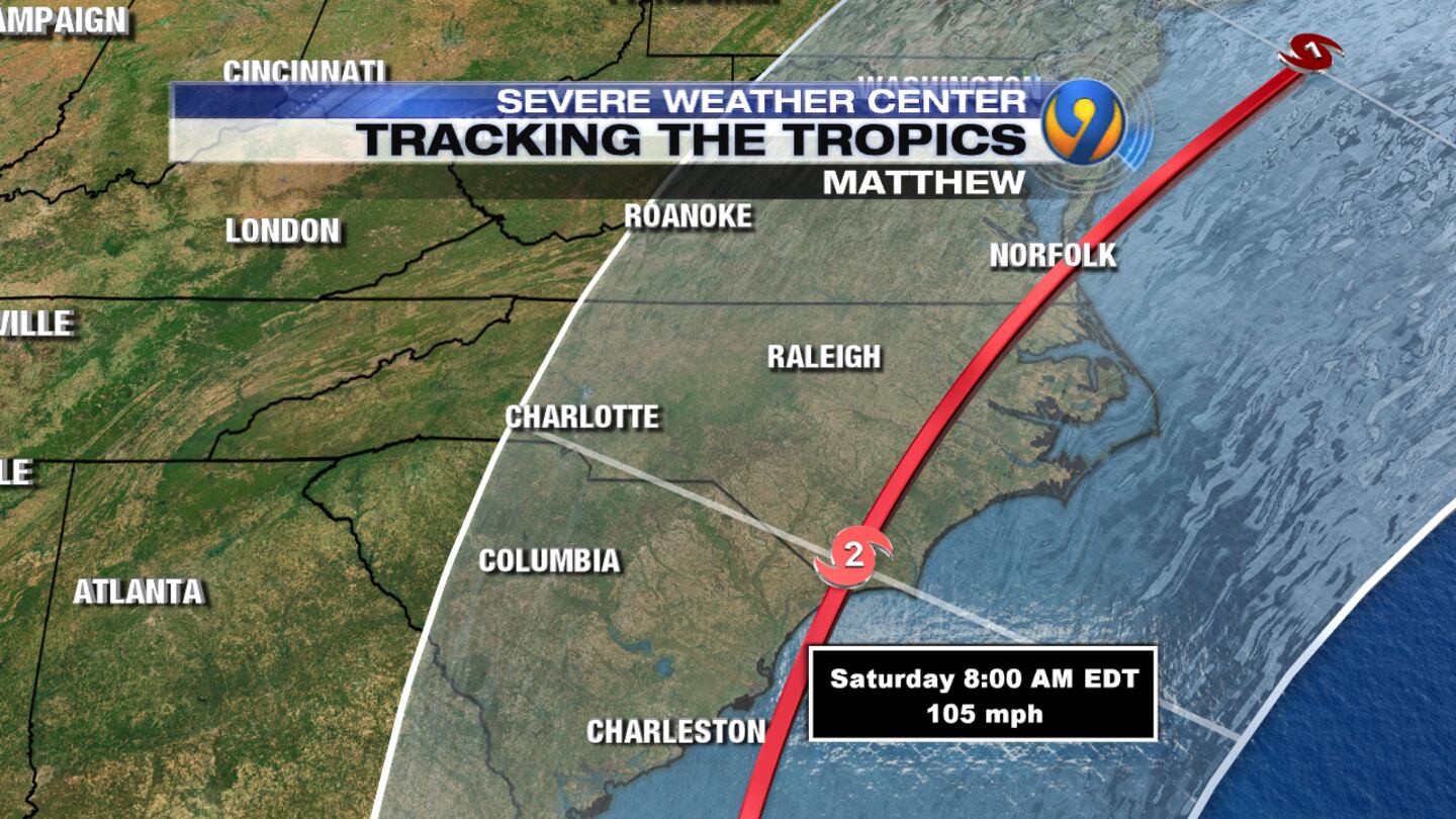 Timing of #Matthew in #NCwx #SCWX still looking like Friday night/Saturday for Charleston --> Outer Banks. @wsoctv #HurricaneMatthew pic.twitter.com/CX7q8j0Ucr