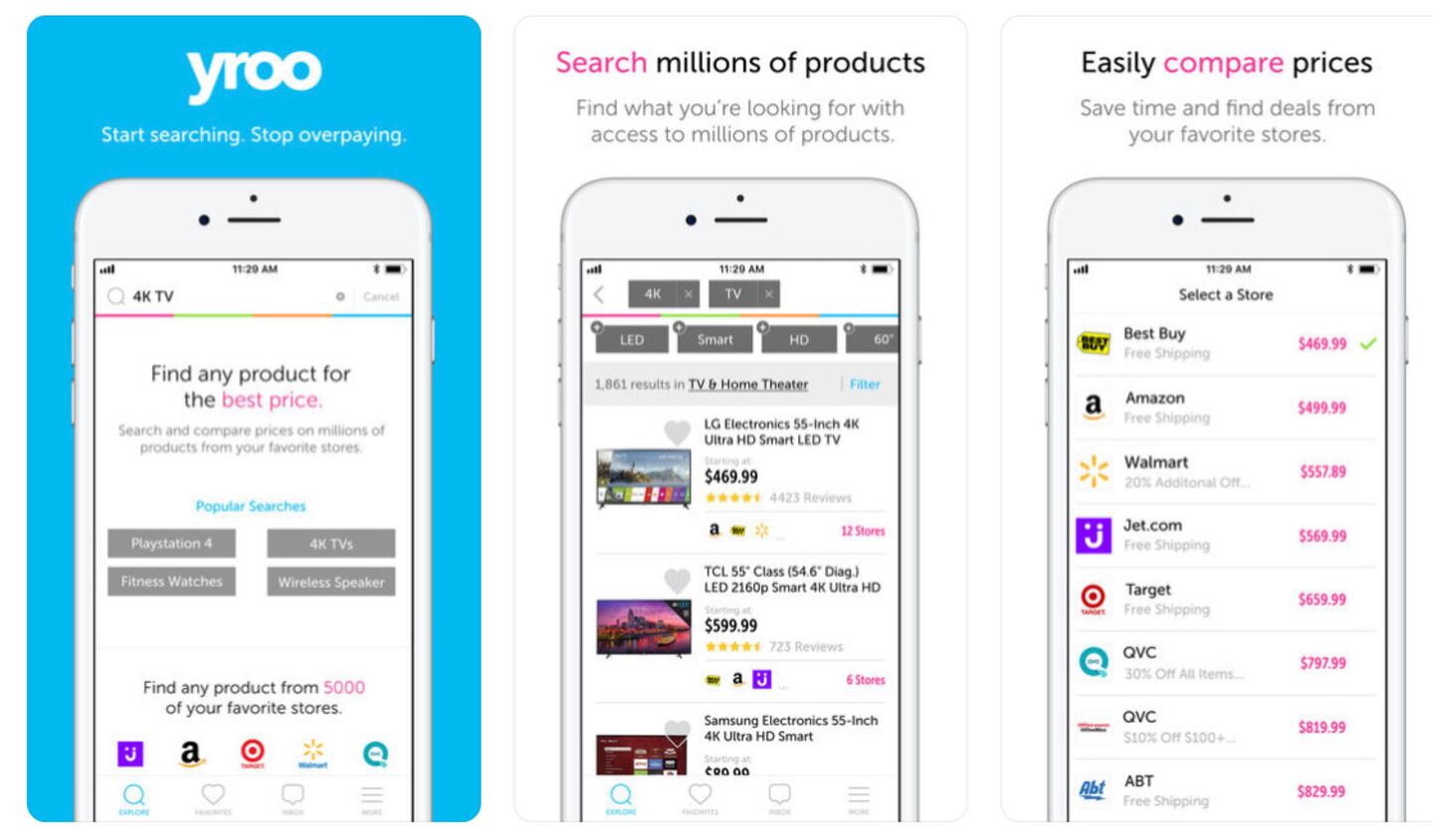 Yroo offers the ability to comparison shop on 5,000+ shopping sites. In addition to an app, there’s also a