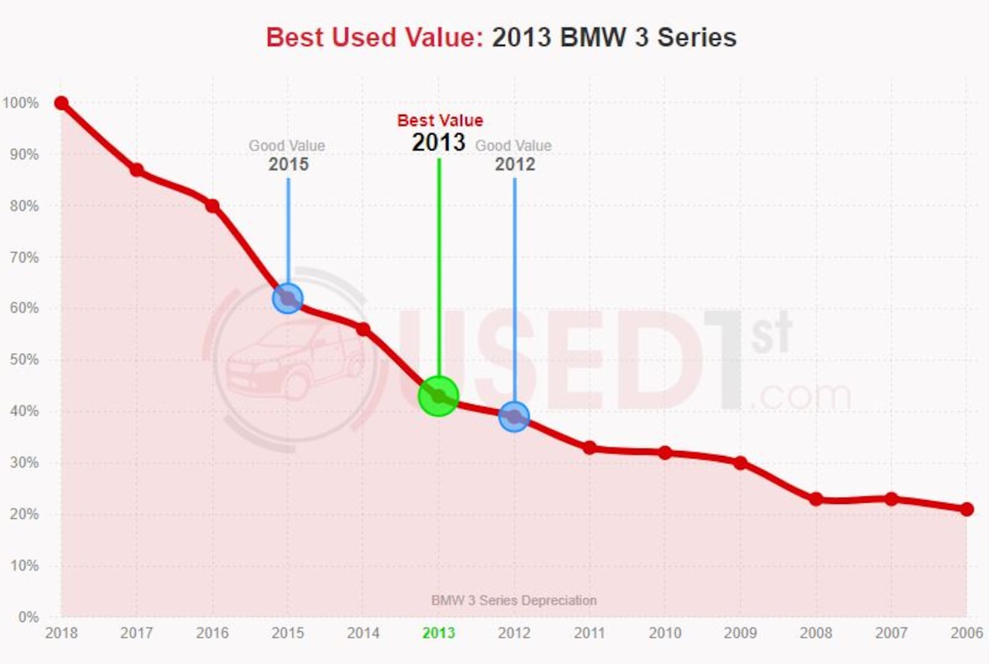 As an exercise, we input a BMW as the make and a 3 Series as the model and hit the red “Go” button. What came back was a graph that determined that we’d get the absolute “Best” value if we purchased a 2013 model. The 2015 and 2012 model years were both identified as “Good” values.