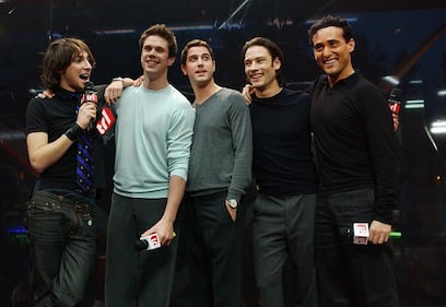 Photos: Carlos Marín through the years 2004: MTV presenter Alex Zane (left) with David Miller, Sebastien Izambard, Urs Buhler and Carlos Marin from operatic vocal group Il Divo during their guest appearance on "MTV's TRL - Total Request Live" show at their studios in Leicester Square, central London. (Yui Mok - PA Images/PA Images via Getty Images)