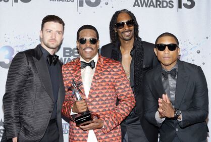Photos: Snoop Dogg through the years 2013: Singer Justin Timberlake, BET Lifetime Achievement Award recipient musician Charlie Wilson, rapper Snoop Lion (formerly Snoop Dogg) and Pharrell Williams in the Backstage Winner's Room at Nokia Theatre L.A. Live on June 30, 2013, in Los Angeles. (Mike Windle/Getty Images for BET)
