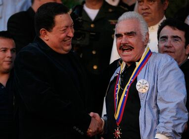 Photos: Vicente Fernandez through the years 2012: Venezuela's President Hugo Chavez, left, shakes hands with Mexican singer Vicente Fernandez at Miraflores Presidential palace in Caracas, Venezuela, Wednesday, Sept. 12, 2012. Chavez decorated Fernandez with the medal "Orden del Libertador," or "Order of the Liberator." (AP Photo/Fernando Llano)