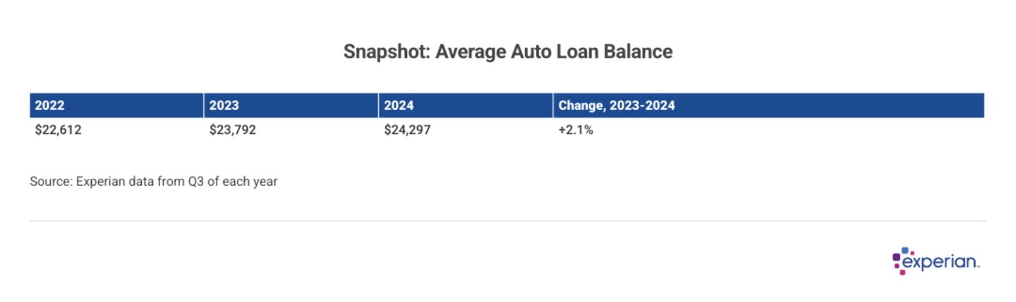 The average auto loan balance held by consumers in the United States increased 2.1% to $24,297 as of the third quarter (Q3) of 2024, according to Experian data. This increase broadly impacted all U.S. regions and consumers of all ages and incomes intending to finance new and used vehicles. The average balance grew less than it did in 2023.