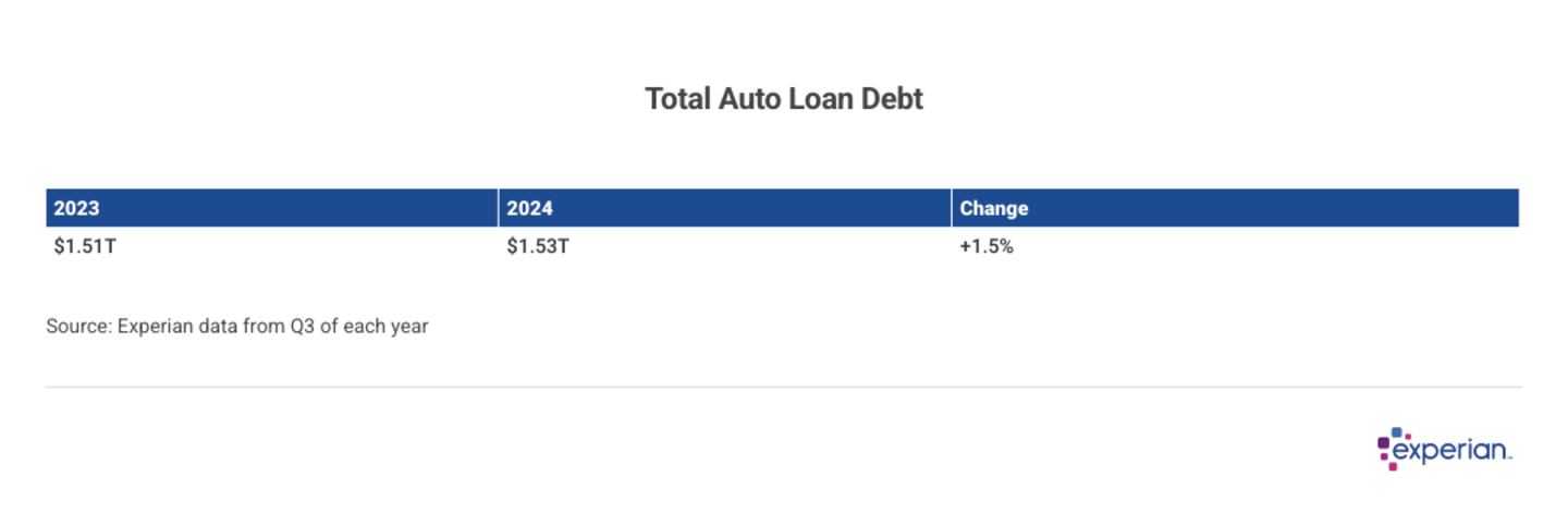 U.S. drivers owed $1.53 trillion on cars, motorcycles and other personal vehicles as of Q3 2024, according to Experian data, an increase of around $20 billion, or 1.5%, over the Q3 2023 balance.