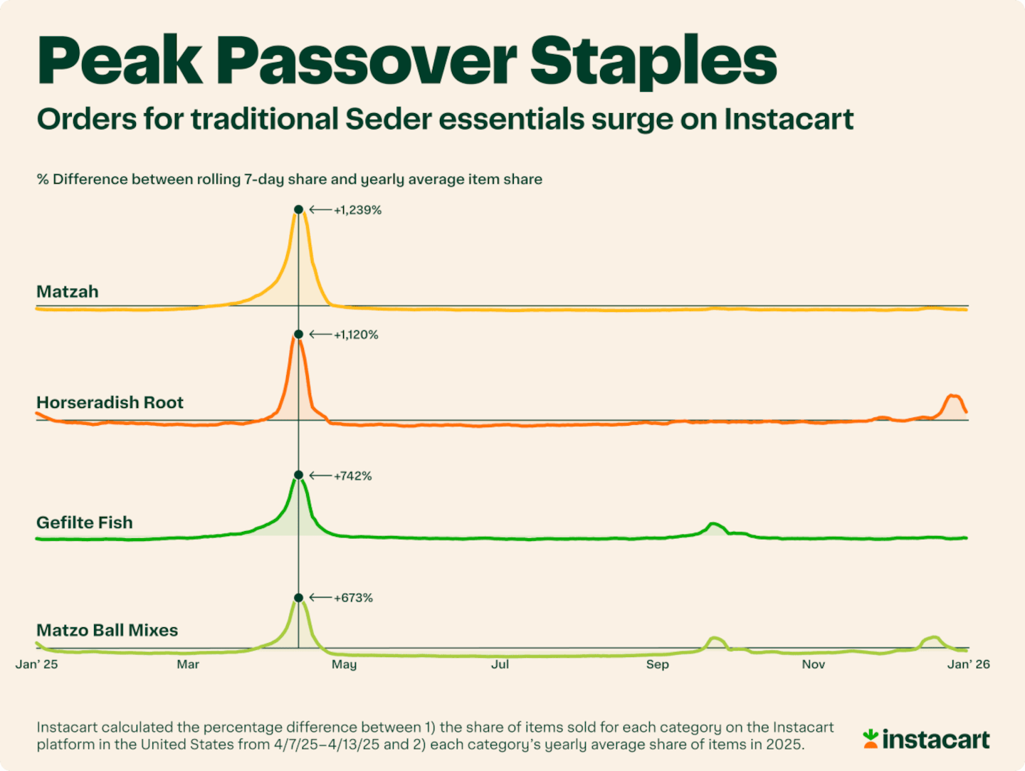 Looking at the week leading up to Passover (April 7-13, 2025), traditional Seder essentials rose sharply compared to their typical yearly share with matzah (+1,239%), matzo ball mixes (+673%), gefilte fish (+742%), and horseradish root (+1,120%).