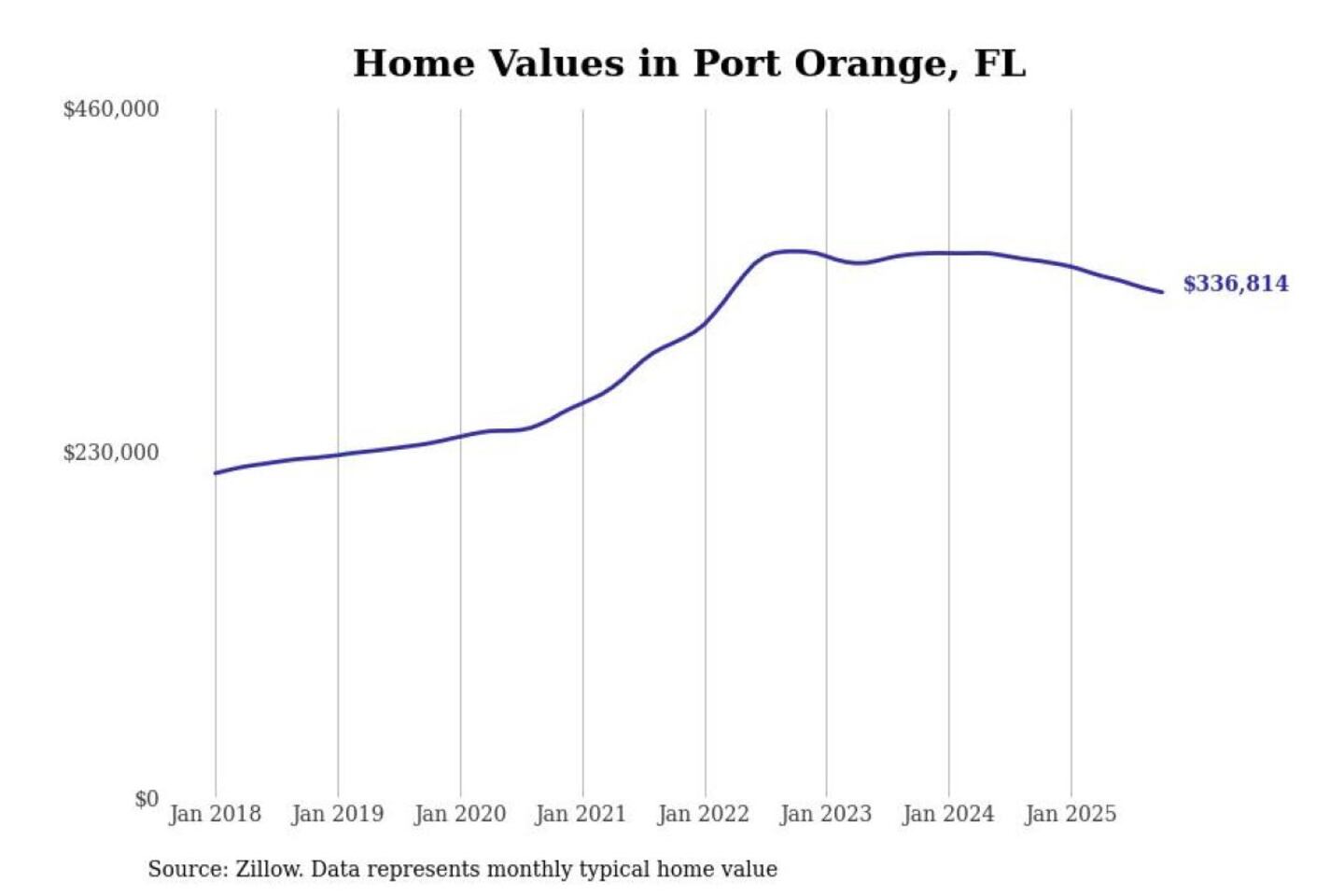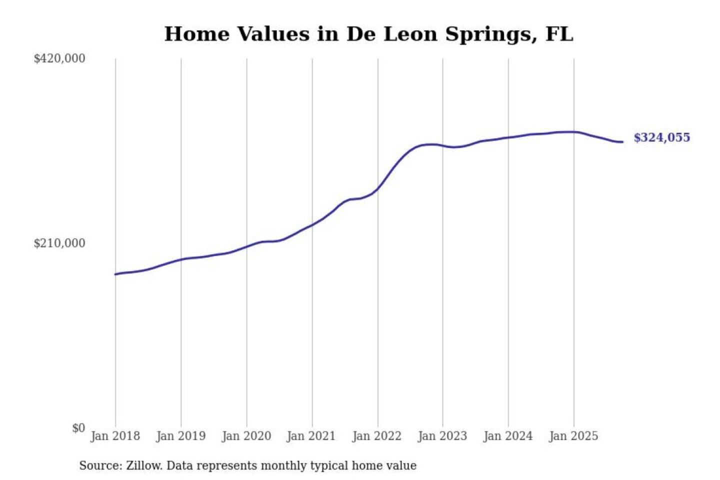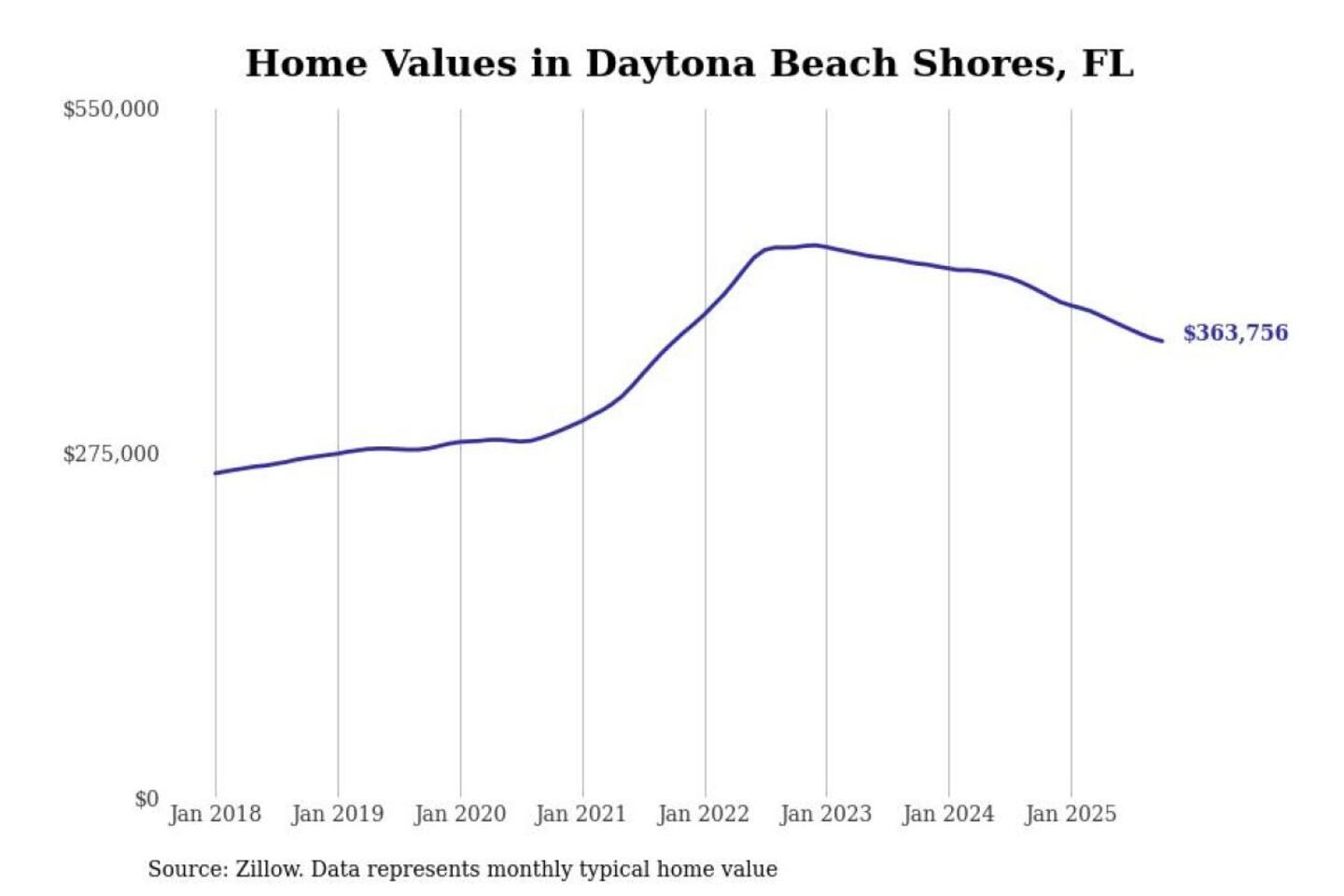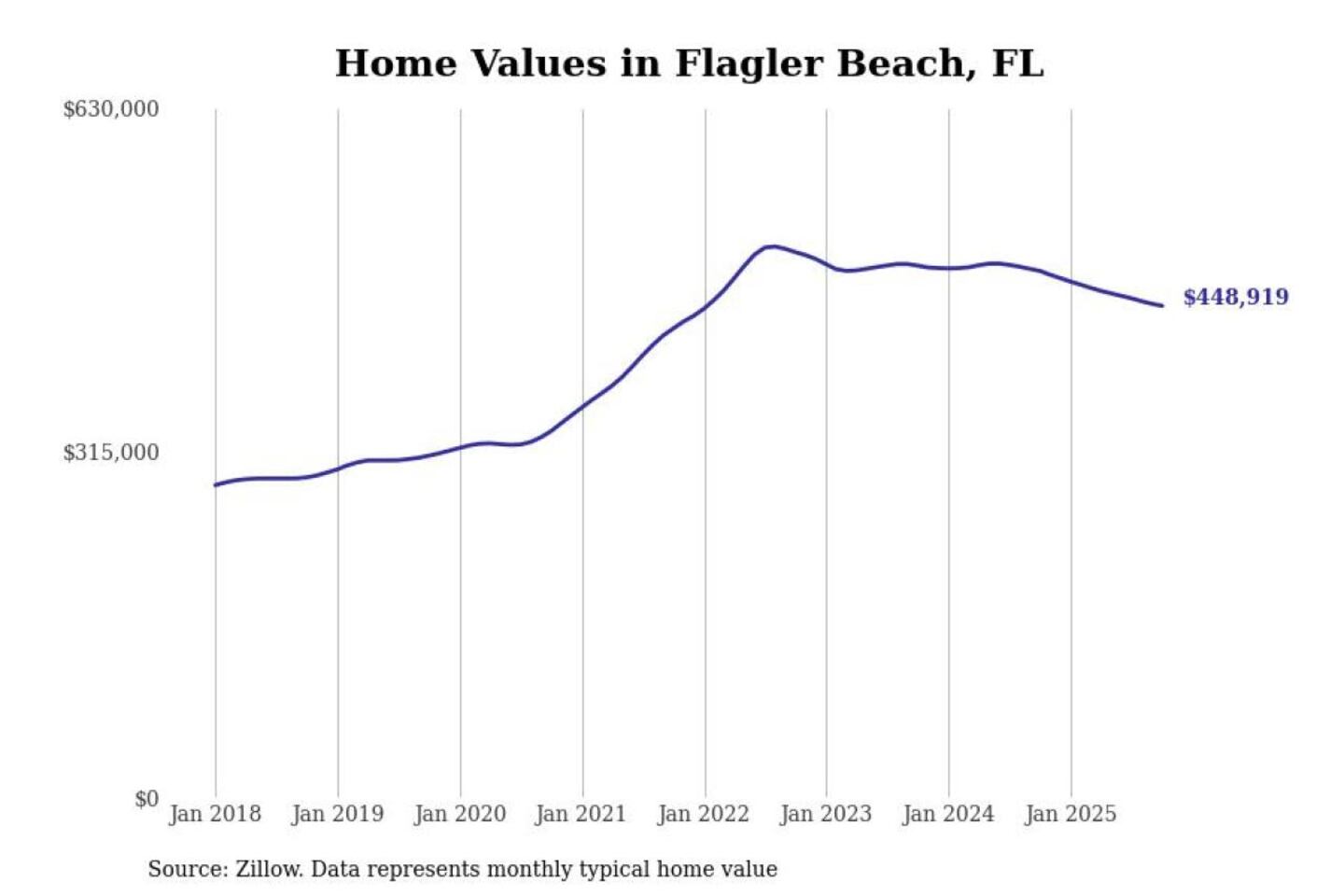 Stacker compiled a list of cities with the most expensive homes in the Deltona-Daytona Beach-Ormond Beach, FL metro area using data from Zillow. Charts show the monthly typical home value since January 2018.
