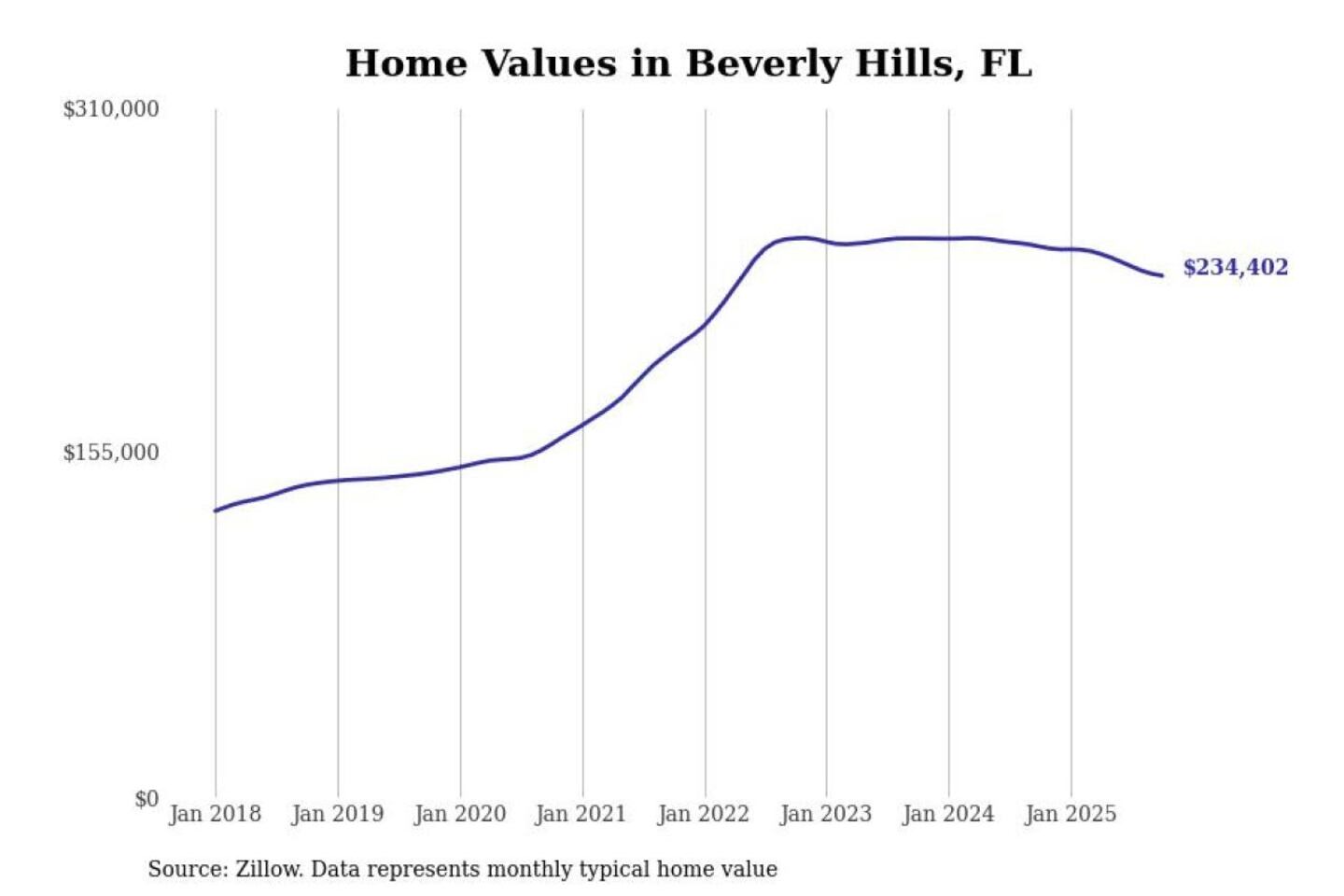 Stacker compiled a list of cities with the most expensive homes in the Homosassa Springs, FL metro area using data from Zillow. Charts show the monthly typical home value since January 2018.