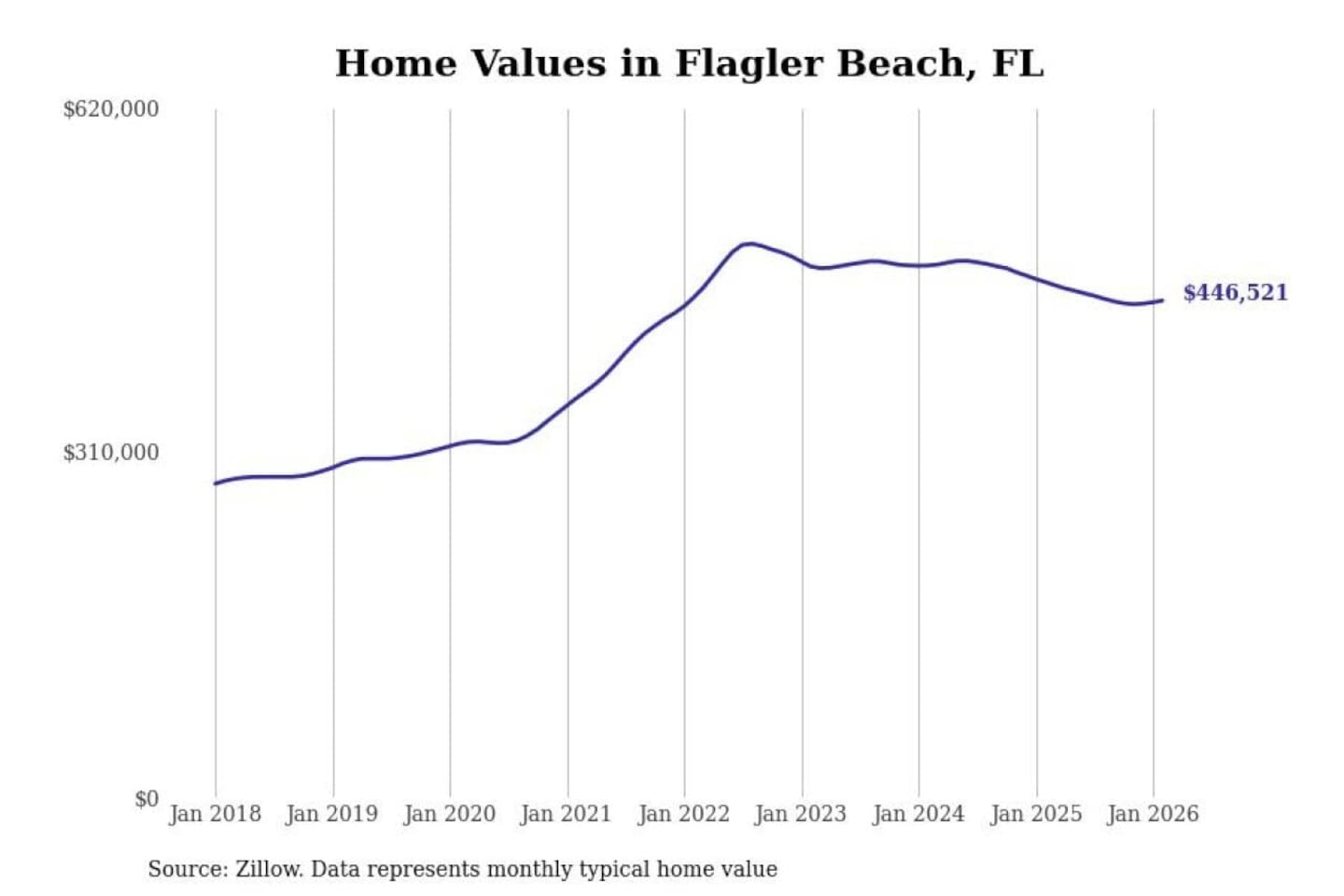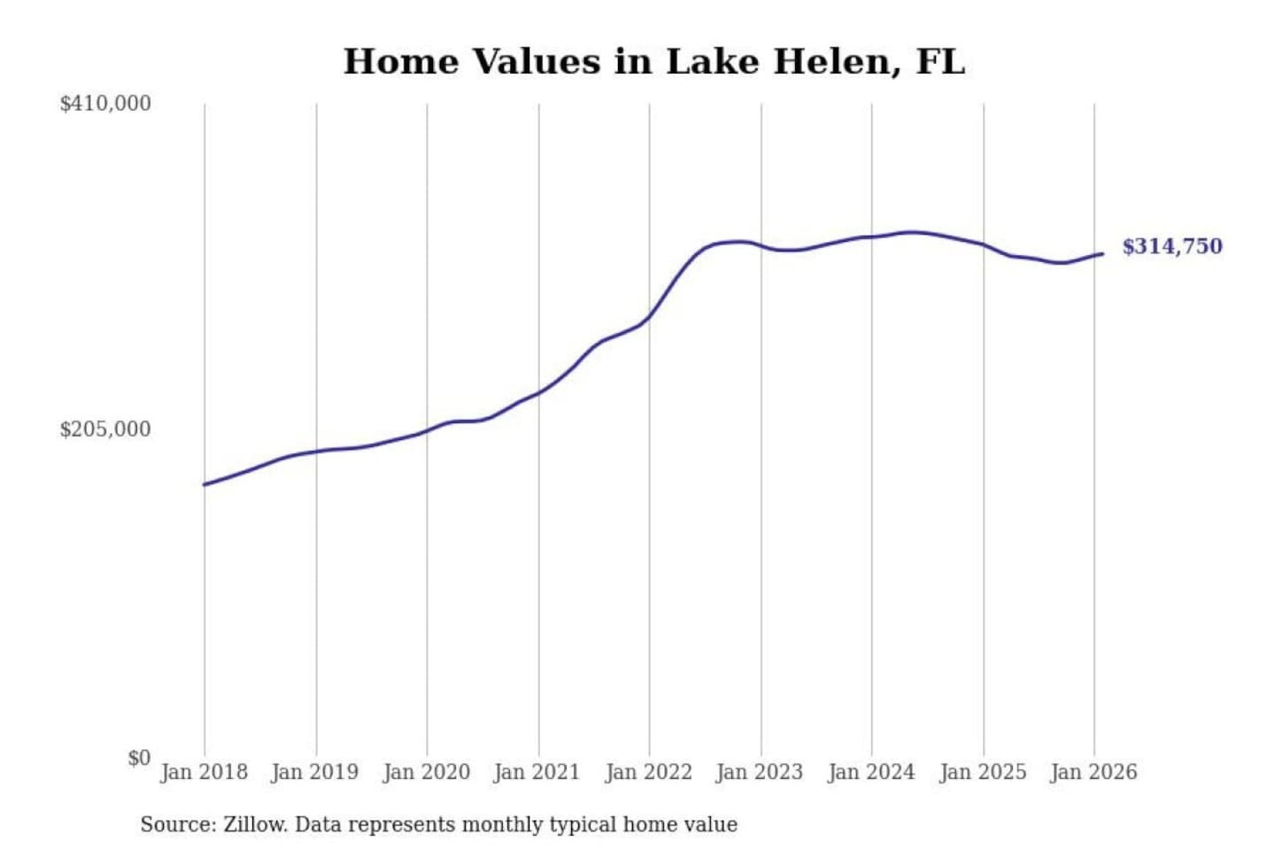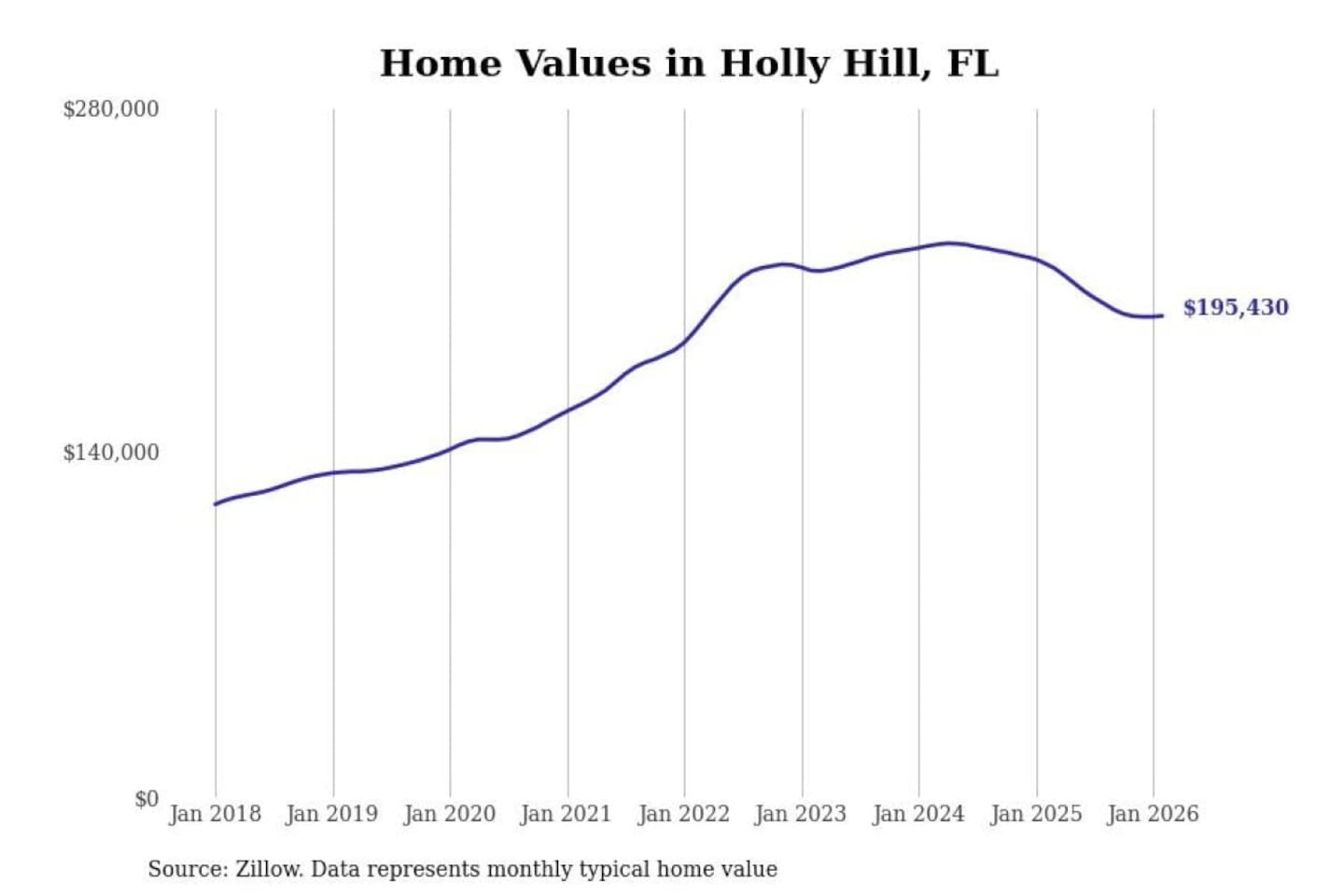 Stacker compiled a list of cities with the most expensive homes in the Deltona-Daytona Beach-Ormond Beach, FL metro area using data from Zillow. Charts show the monthly typical home value since January 2018.