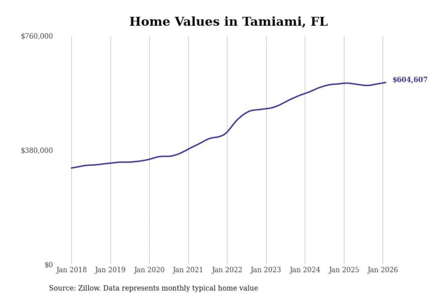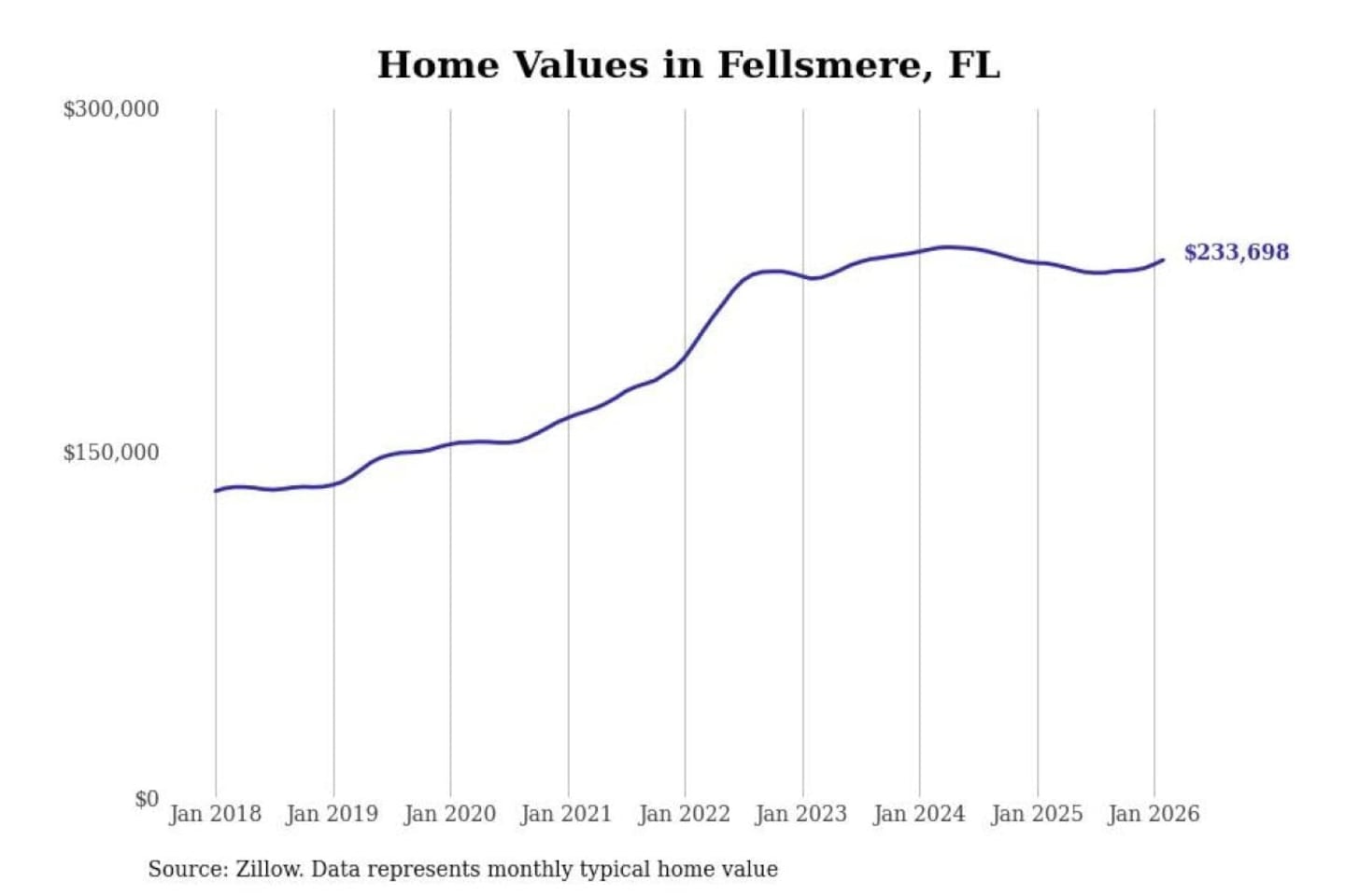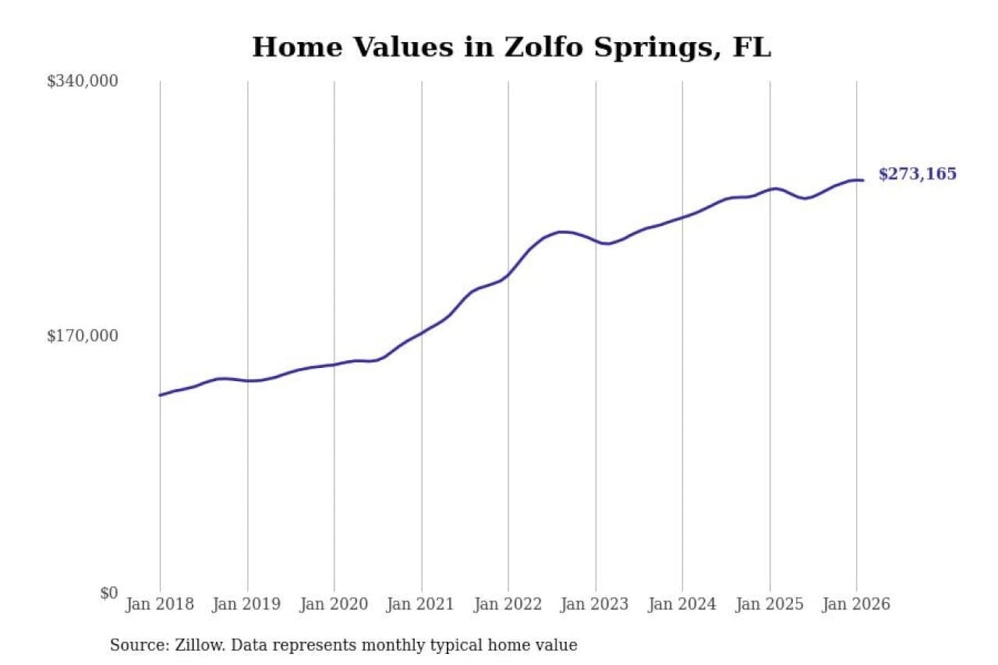 Stacker compiled a list of cities with the fastest-growing home prices in Florida using data from Zillow. Cities are ranked by the dollar change in the Zillow Home Values Index for all homes from the 12 months ending February 2026. The charts in this story were created automatically using Matplotlib. Data was available for 50 cities and towns in Florida.