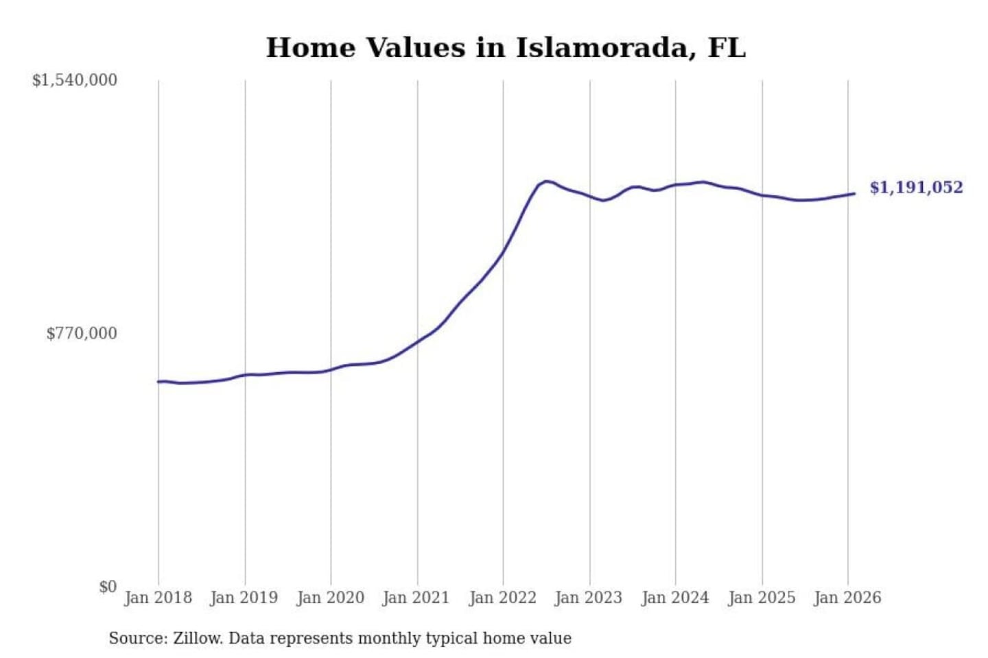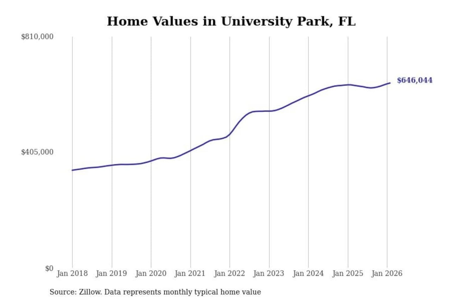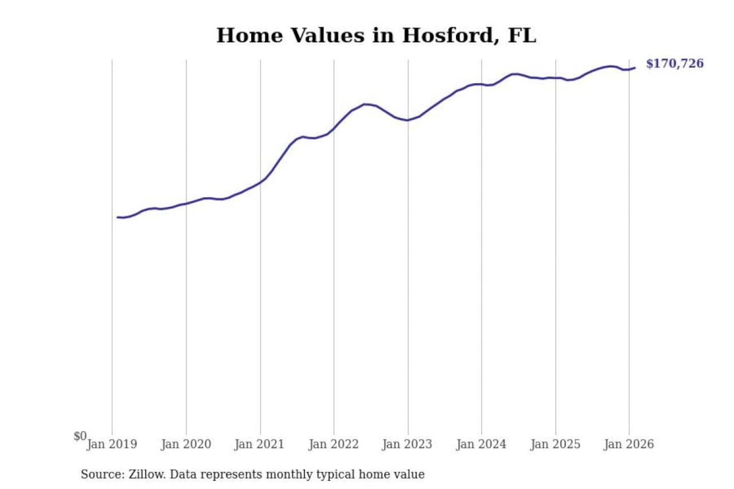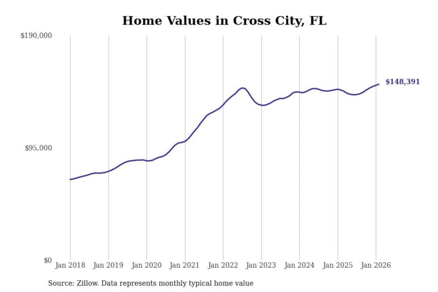 Stacker compiled a list of cities with the fastest-growing home prices in Florida using data from Zillow. Cities are ranked by the dollar change in the Zillow Home Values Index for all homes from the 12 months ending February 2026. The charts in this story were created automatically using Matplotlib. Data was available for 50 cities and towns in Florida.