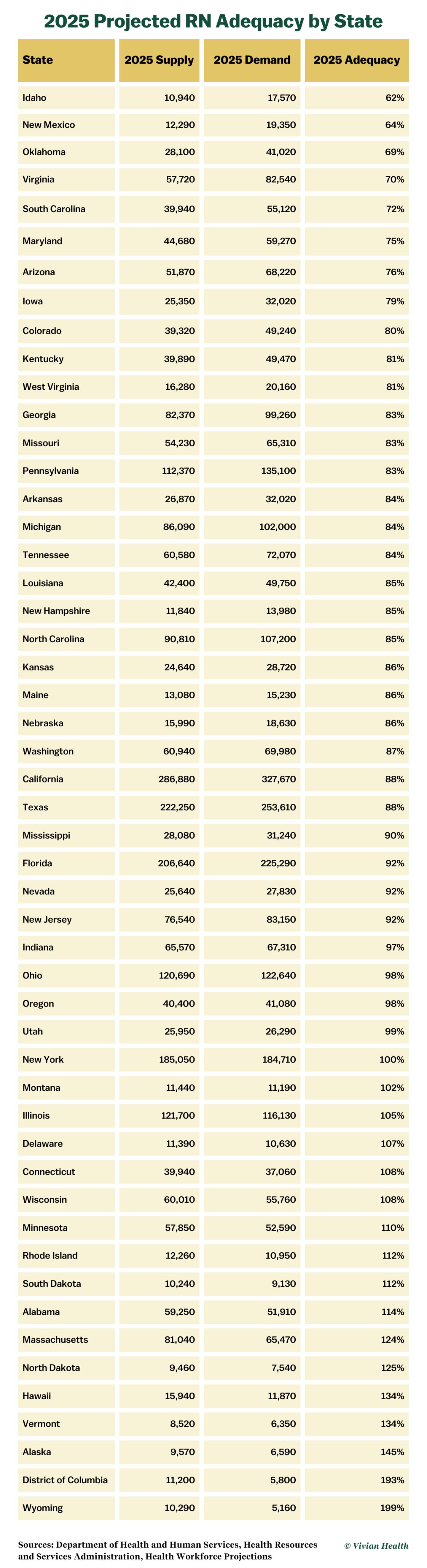Bear in mind that many factors can impact supply and demand, so a projected surplus can quickly become a shortage and vice versa. Many issues can influence whether parameters stay the same for a decade, which is why annual updates are necessary and why Vivian Health updates this post each year as new data becomes available.