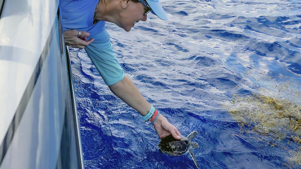 The turtles were carried to the release point by the TS Motorsports MTI powerboat, a 39-foot (12-meter) vessel participating in the Race World Offshore’s Key West World Championship.
