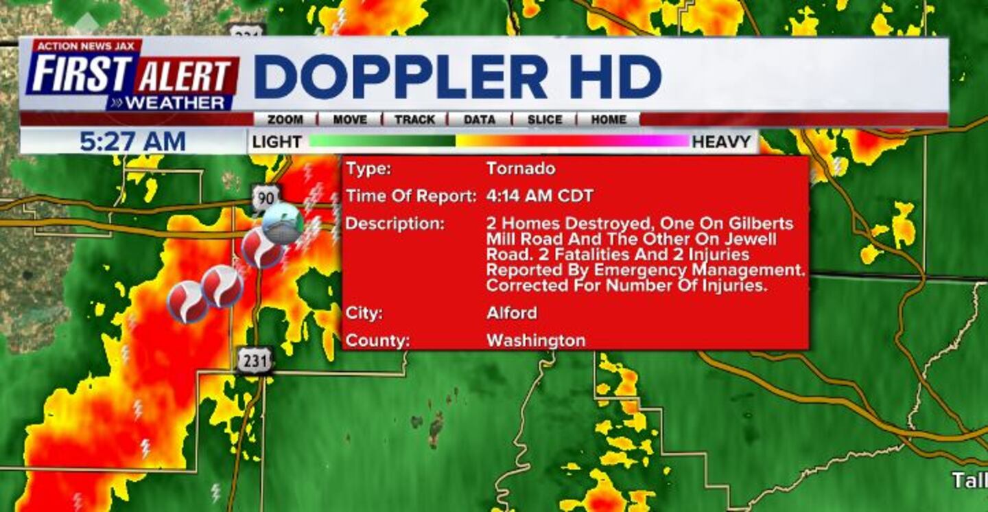WASHINGTON COUNTY, Fla. — Two people are dead and three others are hurt after storms and a possible tornado ripped through the Florida Panhandle Thursday morning, the First Alert Weather Team confirms.