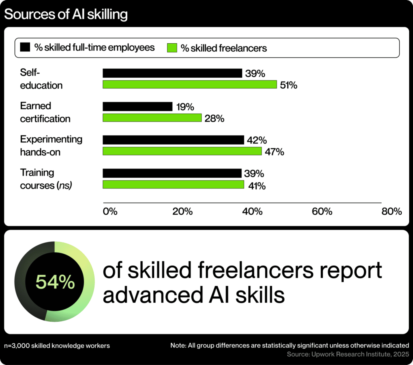 - Skilled freelancers are proving to be more future-ready than full-time employees, excelling in emerging fields such as AI, software development, and sustainability while embracing continuous learning and self-directed skill development. They are leading the adoption of AI tools, with over half (54%) reporting advanced proficiency and indicating superior adaptability, critical thinking, and problem-solving abilities—key attributes for navigating an AI-integrated workforce.