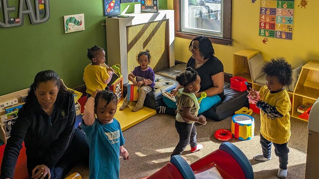 Bright morning sun is streaming through the windows of Sandra Dill's New Haven, Connecticut, home as she reads a picture book about penguins to a room full of busy toddlers. While listening, the kids blow kisses, plop in a visitor's lap, then get up to slide down a small slide.