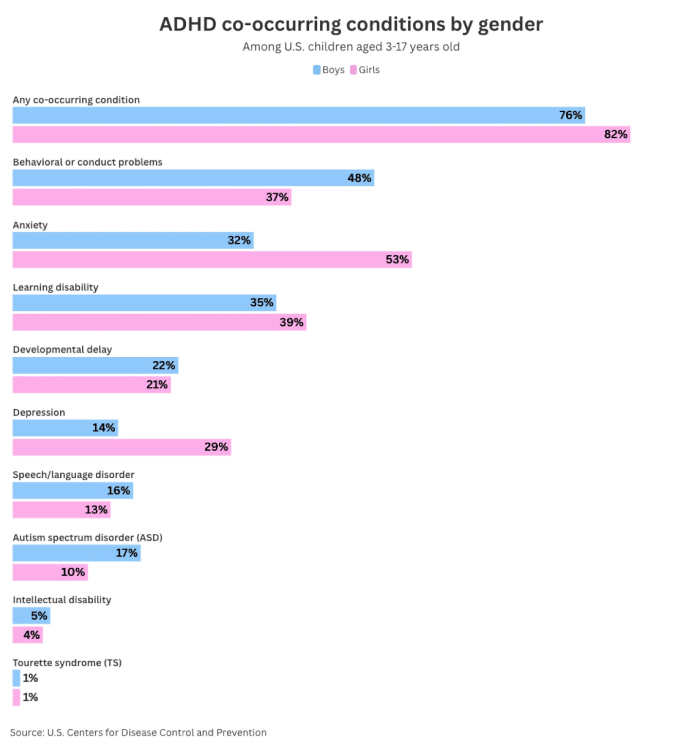 The chart above highlights clear gender trends. Girls with ADHD are more likely than boys to also be diagnosed with anxiety (53% vs. 32%) and depression (29% vs. 14%). These internalizing disorders can cloud the picture. Clinicians may attribute a girl's focus issues or forgetfulness to mood rather than attention. That's a phenomenon known as diagnostic overshadowing, where one visible condition draws all the attention, leaving others undetected.