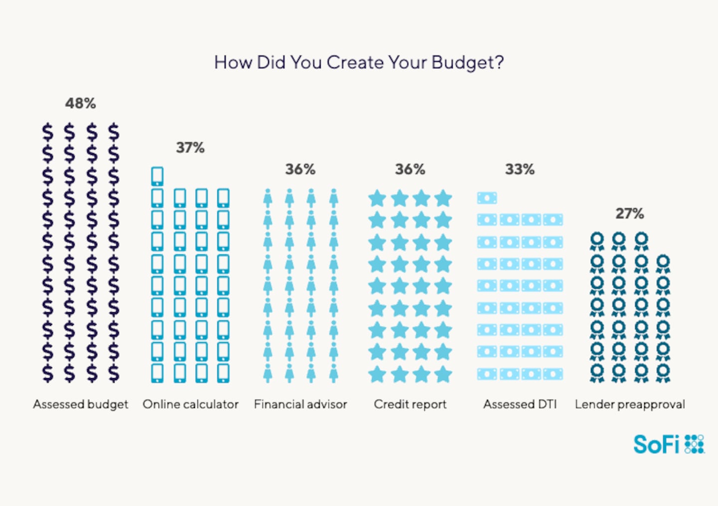 Would-be homeowners were using several methods to establish their budget. Forty-eight percent were assessing their current budget, while 37% used an online home affordability calculator. Consulting a financial advisor was also popular: 36% of people used this method. Reviewing credit scores and reports was a popular step for 36% as well. A third of shoppers (33%) assessed their debt-to-income (DTI) ratio. Twenty-seven percent got preapproved by a lender as a way of determining their budget.