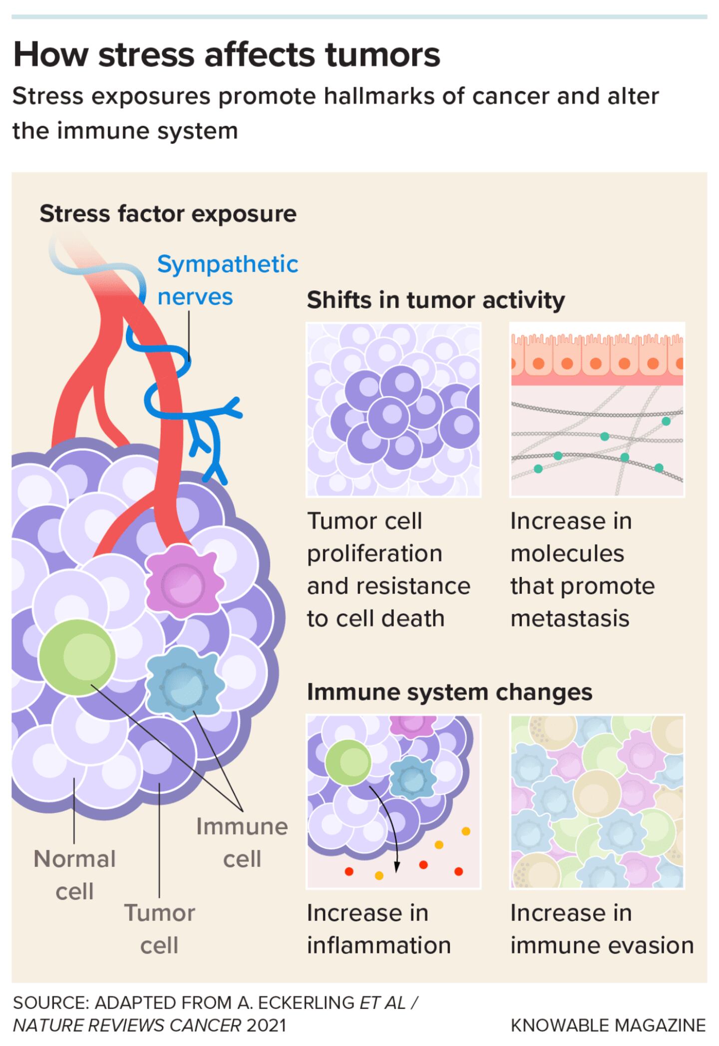 Research by other groups has shown that stress can lead to molecular changes, particularly within the immune system, that influence how cancer progresses. Some of this work suggests that, when stress leads to inflammation—a broad immune reaction typically brought on by injuries and infections—it can boost the growth of tumors.