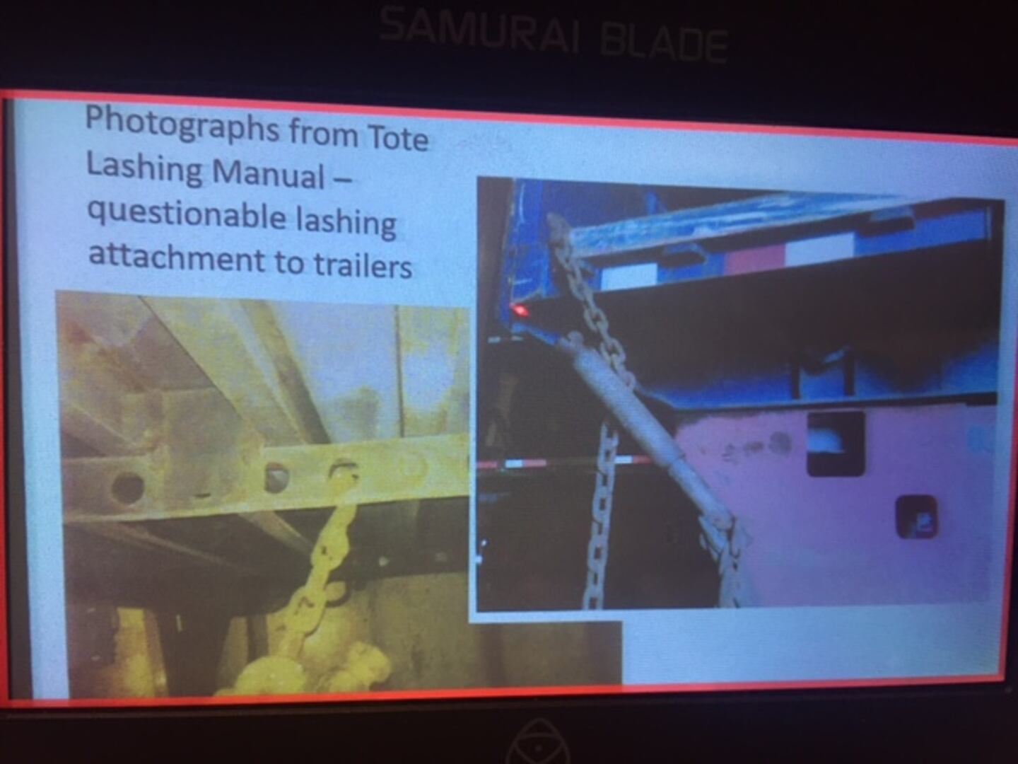 Anderson pointed to some cargo not being secured according to the 45-degree angle needed for the lashing device.