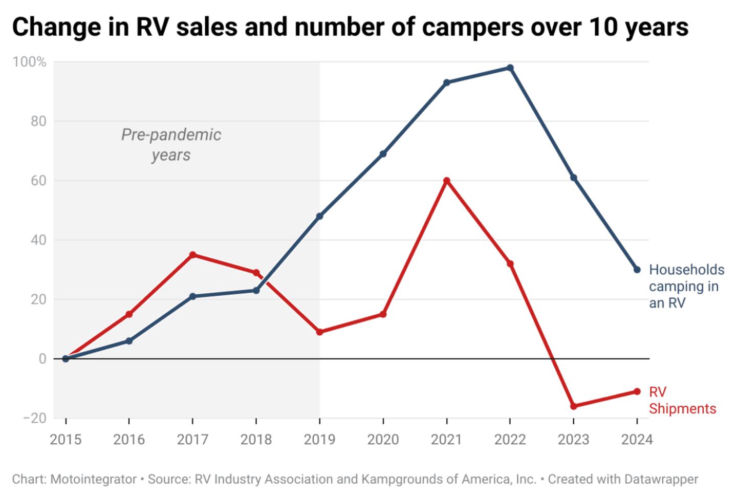 It turns out, when you sell a record number of campers in a few short years, there’s not a lot of fresh demand left after the rush, which is the key reason why RV sales today are lower than they were even a decade ago.