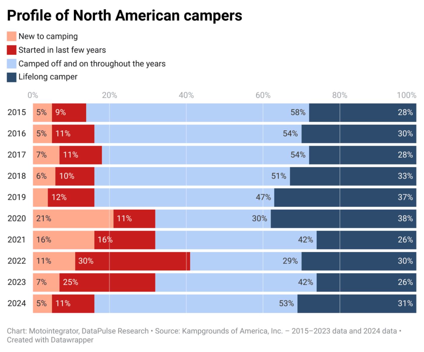 In 2022, people who were relatively new to camping accounted for more than 40% of all campers. After that peak though, the numbers dropped off pretty quickly. The mad rush to join the vanlife community was over, new blood was not coming into the vanlife community as quickly, and there was attrition among the vanlifers who had given it a shot. By 2024 the share of relatively new campers had dropped to 16% — levels that were typical before the pandemic hit.