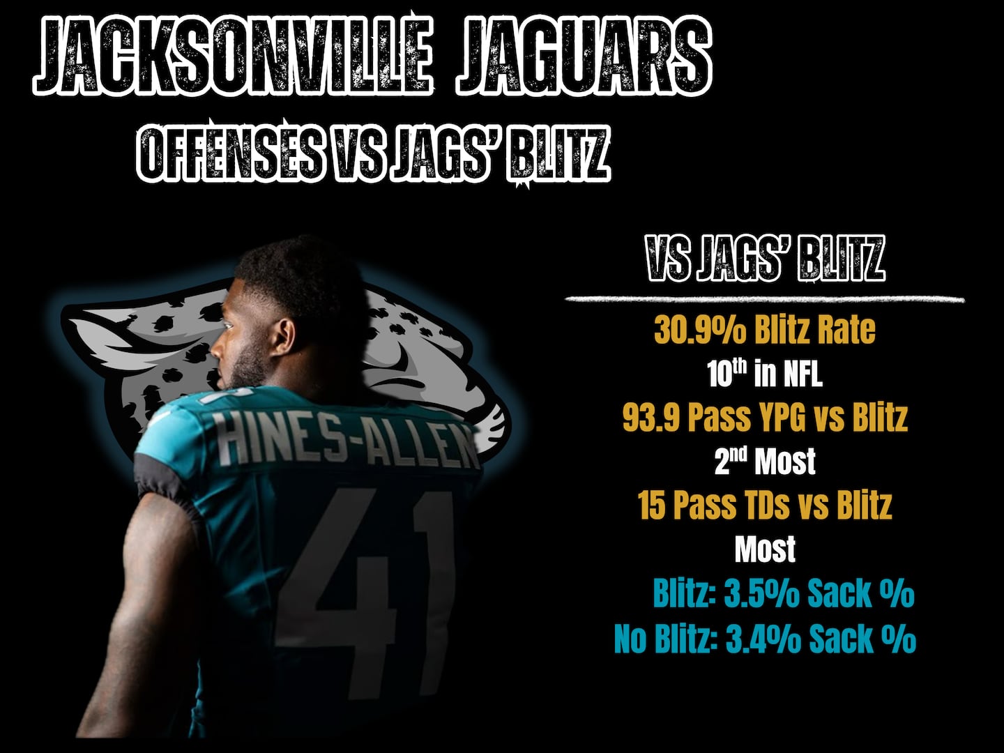 At its expense, the Jaguars are suffering explosive play after explosive play, including the league-leading 15 touchdowns. Opposing offenses are averaging 7.3 yards per passing play, fourth highest in the NFL against the blitz, compared to the 6.0 yards per play, 19th highest, without.