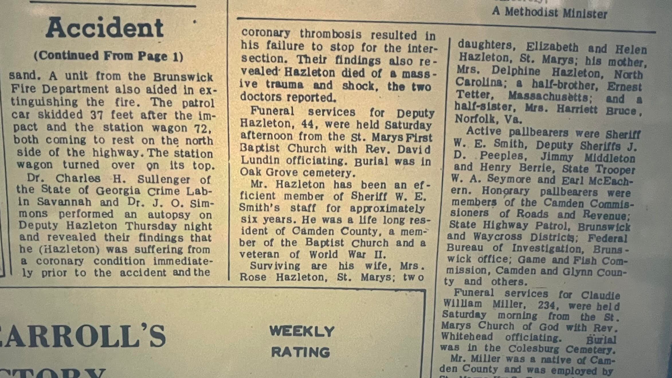 On March 5, 1964, Deputy John Arthur Hazelton was killed in a car crash involving 2 other vehicles in Glynn County. Passengers in Hazelton’s patrol car also died in the crash.