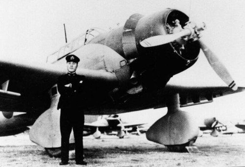 Zenji Abe stands with his plane, part of the bombing mission on Pearl Harbor on Dec. 7, 1941. (Kent D. Johnson)
