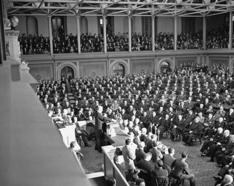 Tense faces of Congressmen, cabinet members, Supreme Court justices, crowded galleries looked to a grim President Franklin D. Roosevelt as he asked for war against Japan. (AP Photo/FILE)