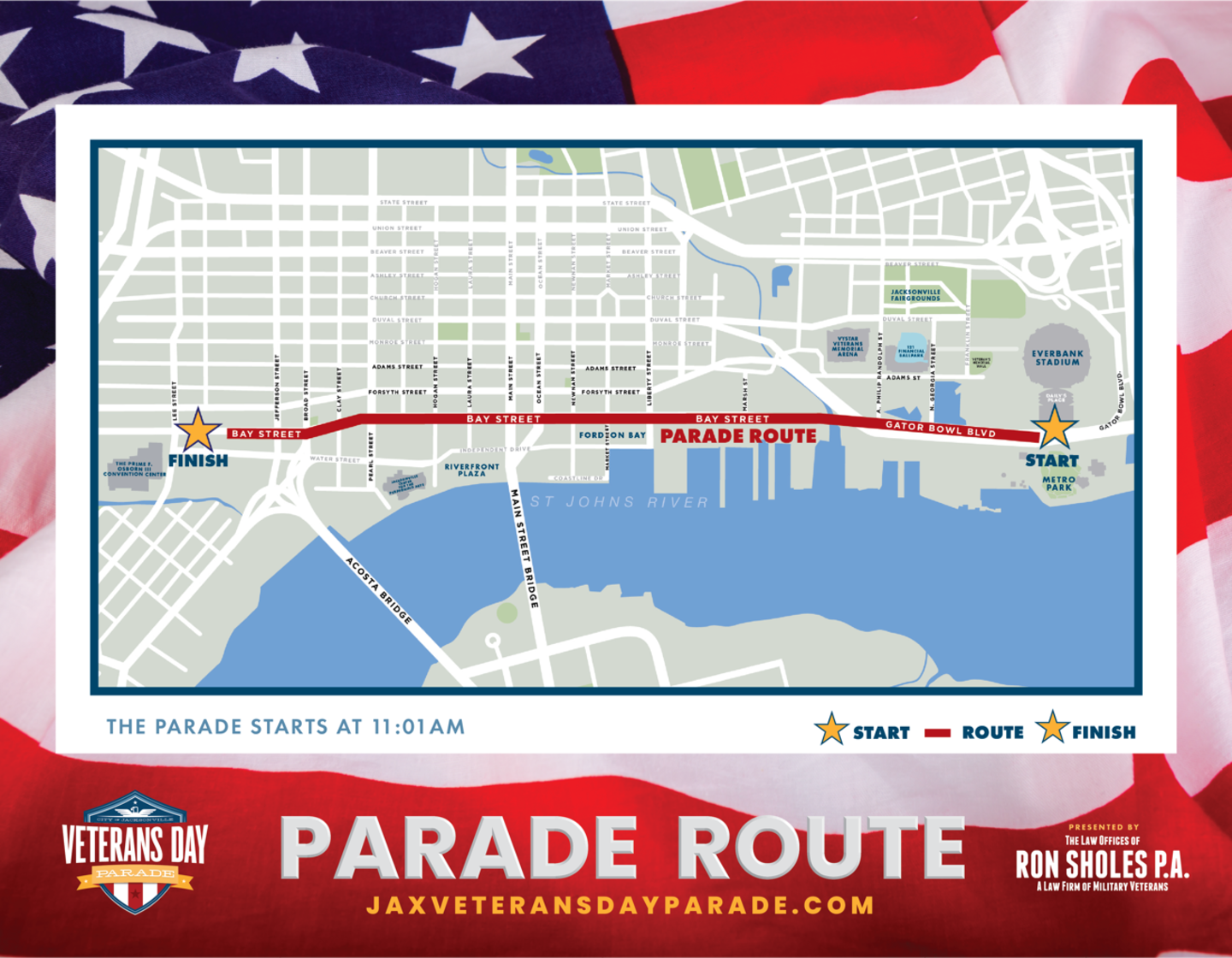 The parade will wind through the streets of Downtown Jacksonville on Saturday, Nov. 11 starting at 11:01 a.m.