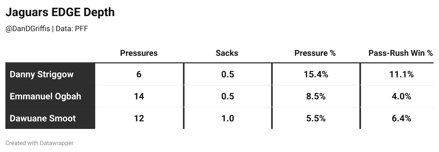 For a defense that has been hampered by the lack of a pass-rush and their depth, Striggow has been electric for the Jags. In the last two weeks of play, he’s helped the Jaguars total nine sacks and 21 QB hits. Both games featured pressure rates over 40% as well.