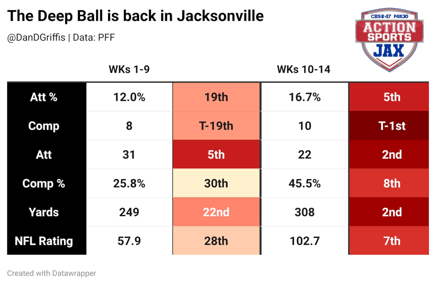 Over the last five weeks, Trevor Lawrence has completed 10 of his 22 attempts for 308 yards. That 45.5% completion rate is nearly double that from the first nine weeks. His 10 completions over 20 yards downfield is tied for first in the NFL over that time frame, while his 308 yards rank second.