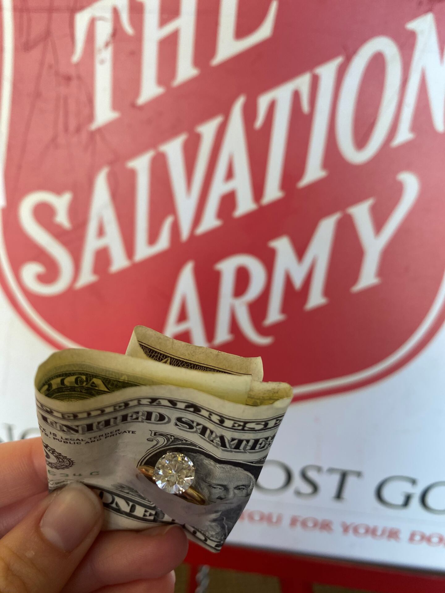 The engagement ring had been taped to a dollar and dropped into a kettle at a local Publix by an anonymous donor. The ring was taken to Miriam’s Jewelers in San Marco and appraised between $8,000 and $9,000.