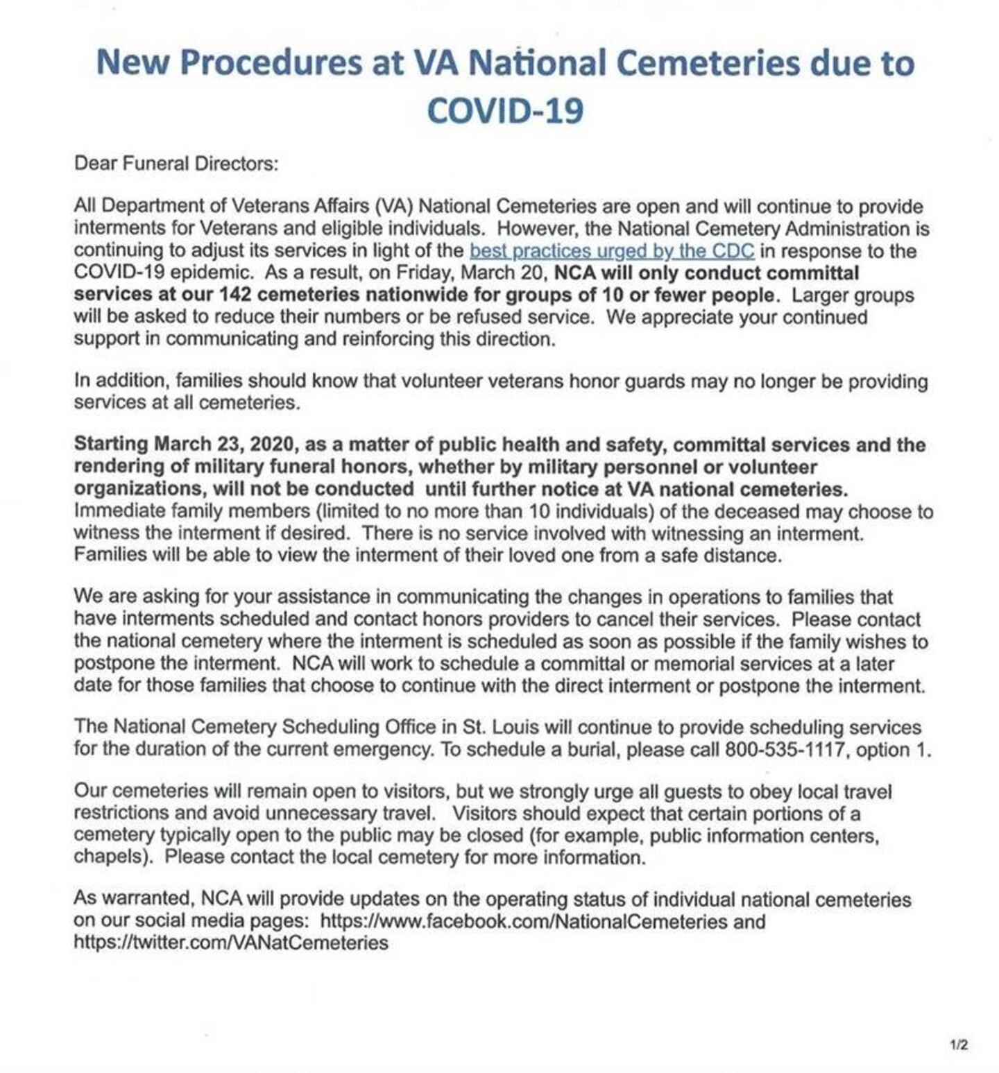 On March 22, Jacksonville National Cemetery changed its policy regarding burial services and military honors. They now only allow 10 individuals and you view the burial from a distance.