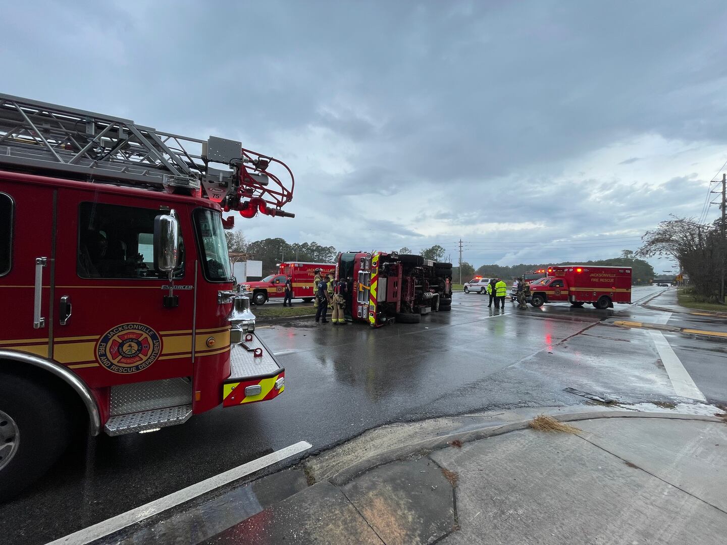A spokesperson with JFRD told Action News Jax the crash was weather-related and the three firefighters in the truck have been taken to the hospital over an abundance of caution.