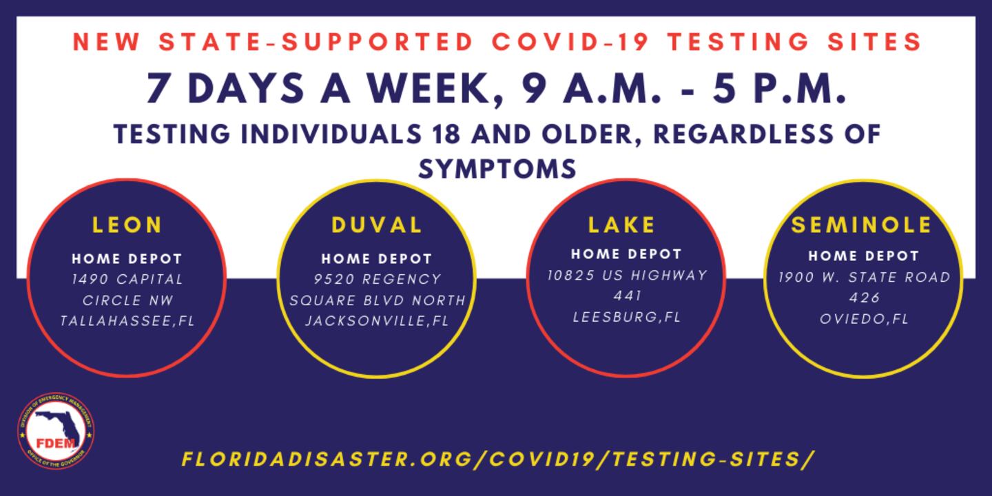 New city-run testing sites are open in East Arlington at Ed Austin Park from Monday through Wednesday 7 A.M. to 3 P.M. and at the Beaches at the old K-Mart on Atlantic Blvd. That site is open Thursday through Saturday 7 A.M. to 3 P.M. There is also a site at the Mandarin Senior Center. These tests are all free of charge.