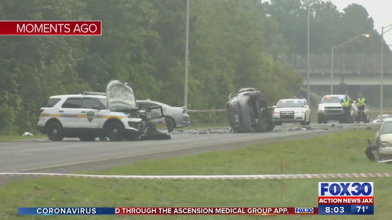 The Jacksonville Sheriff’s Office said in a news conference that one person is dead after the crash involving four cars, including a JSO patrol car. The identity of the person killed has not been released at this time.