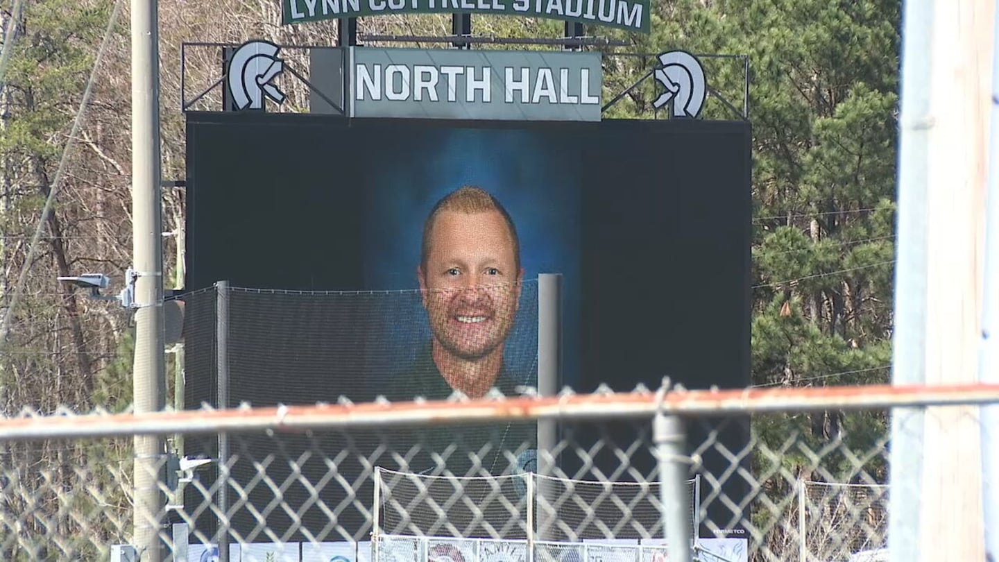 On the North Hall High School football field Monday, it was quiet and it was solemn as the picture of teacher and coach Jason Hughes was posted on the Jumbotron.