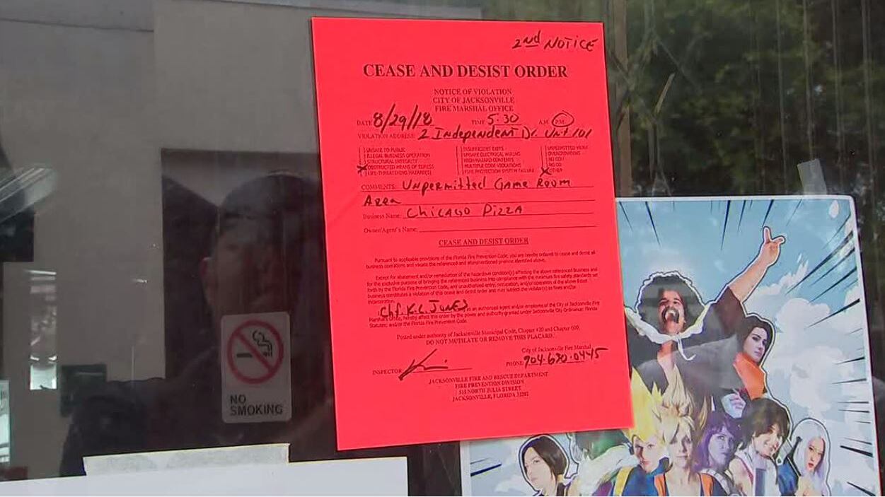 #BREAKING: We were at Chicago Pizza as cease and desist order was put on the front door. Chief Jones said Landing was notified today. This violation states an unpermitted game room area @ActionNewsJax pic.twitter.com/jCcXnuGa1T