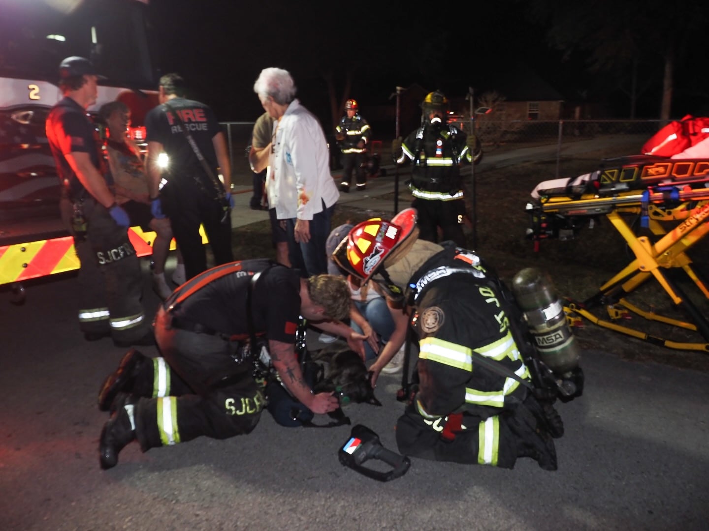 The fire department shared a photo of the crew who appeared to be resuscitating the dog.