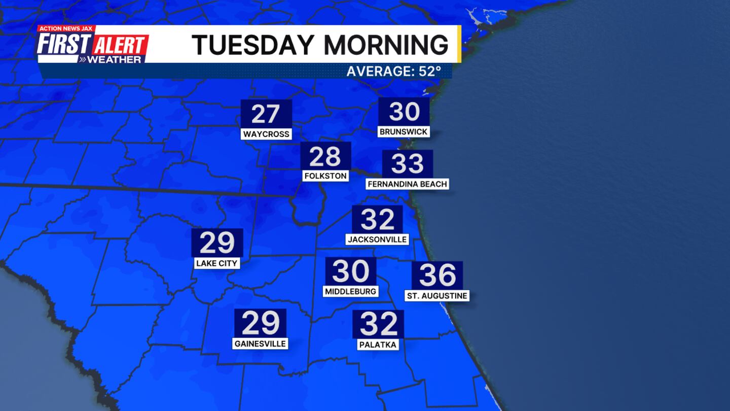 JACKSONVILLE, Fla. — Tuesday morning drops to freezing while Wednesday morning will be near freezing too.