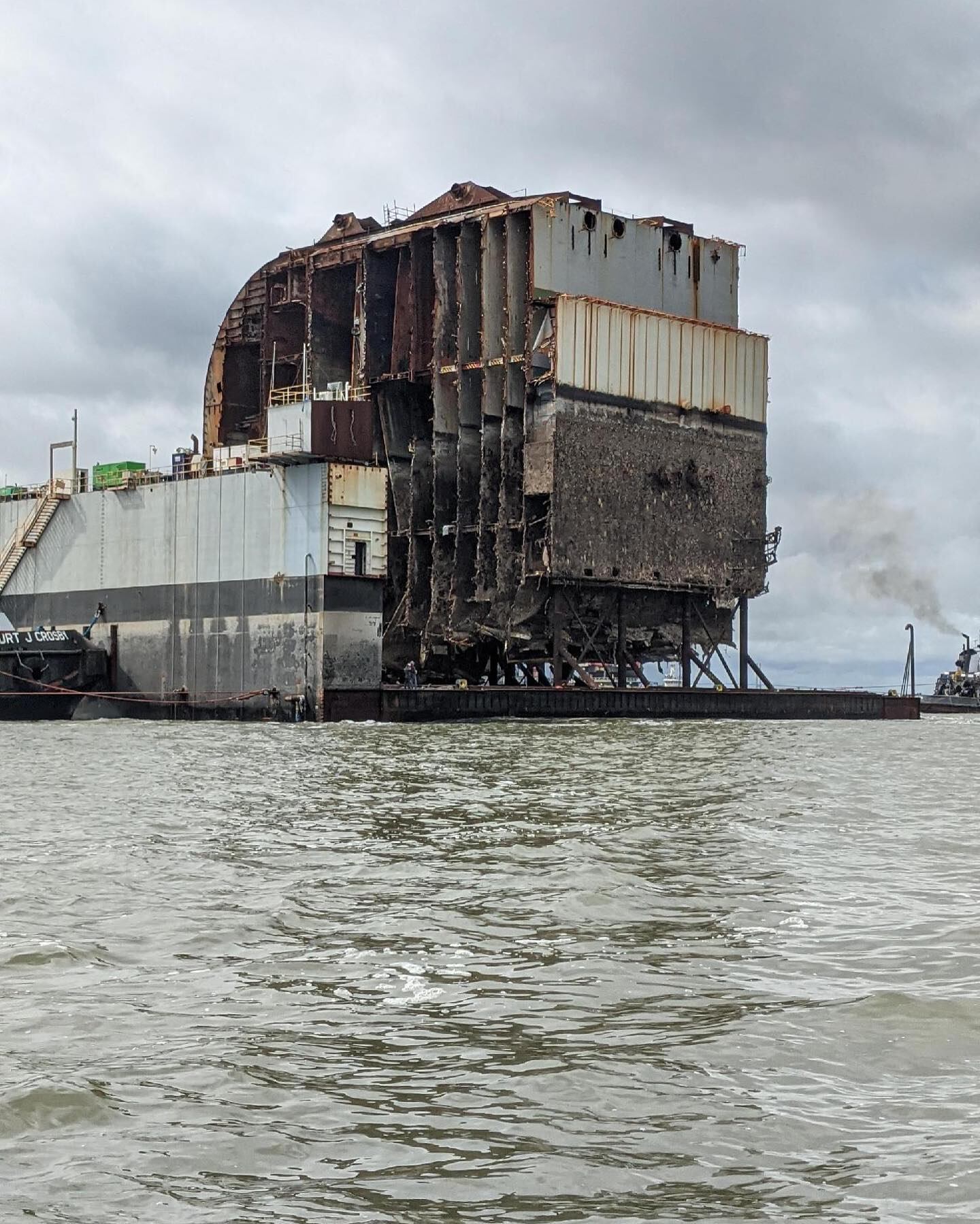 It was announced the ship would be cut into seven pieces and later transported in pairs to a Louisiana recycling yard on a specialized barge called Julie B, a 400-foot long, 130-foot wide, high deck strength barge able to carry loads up to 4,200 pounds per square foot.
