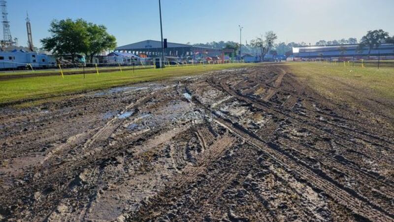 The cause of this buildup? Due to heavy rain on Saturday, the dirt parking lot quickly became a mud bowl, risking many cars getting trapped. The majority of the parking on-site was closed for safety and to help the ground dry.