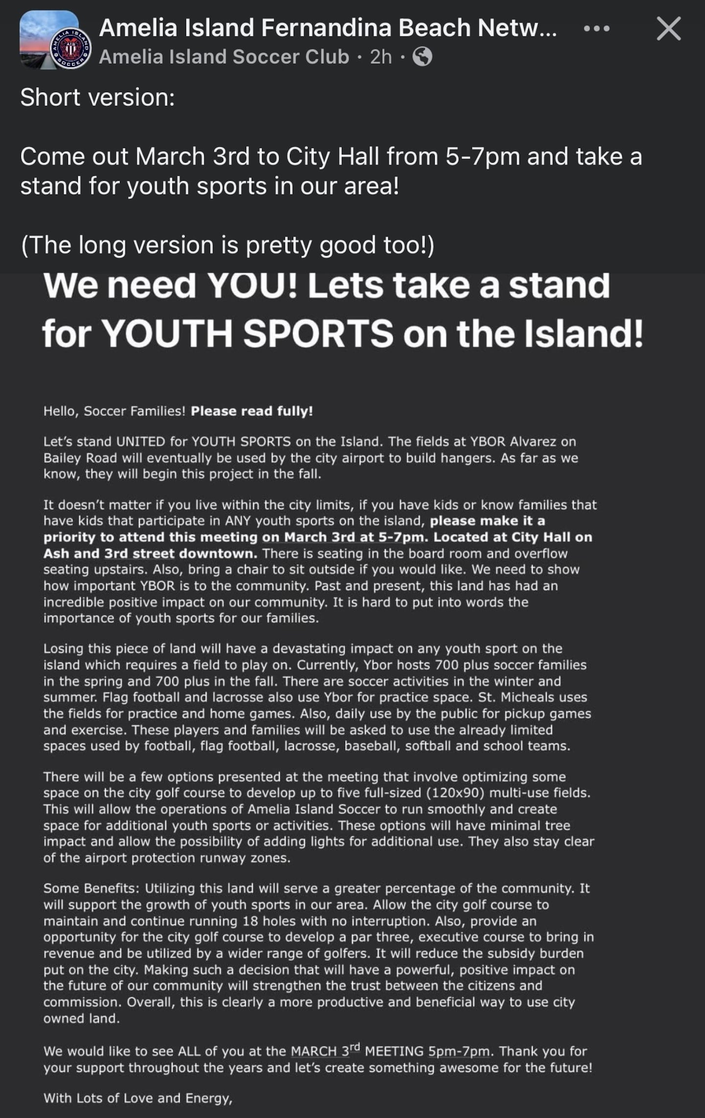 The city of Fernandina Beach is considering replacing long-standing soccer fields at the Ybor Alvarez Ball Park with private aviation hangars.