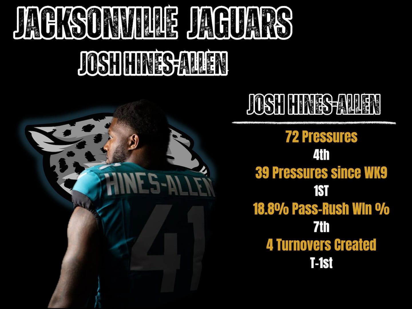 Josh Hines-Allen, however, has ascended since the Jaguars defeated the Las Vegas Raiders in overtime. His 1.5 sacks late in that game were critical towards the win and since has been on a tear, totaling 6.5 sacks in the last six games for the Jaguars. He also happens to lead the NFL in pressures (39) since the Jaguars bye, according to Pro Football Focus.