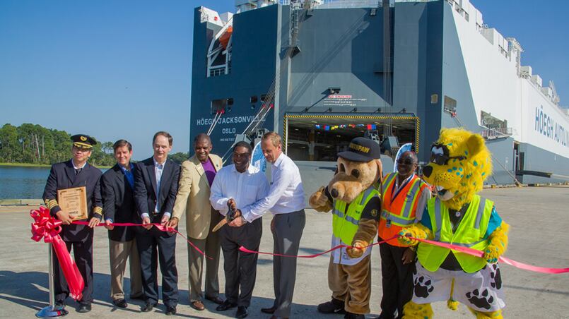 Jacksonville Mayor Alvin Brown joined executives from Höegh Autoliners and JAXPORT in to welcome the company’s newest auto ship, Höegh Jacksonville, for its inaugural visit to the city it was named after Friday afternoon.
