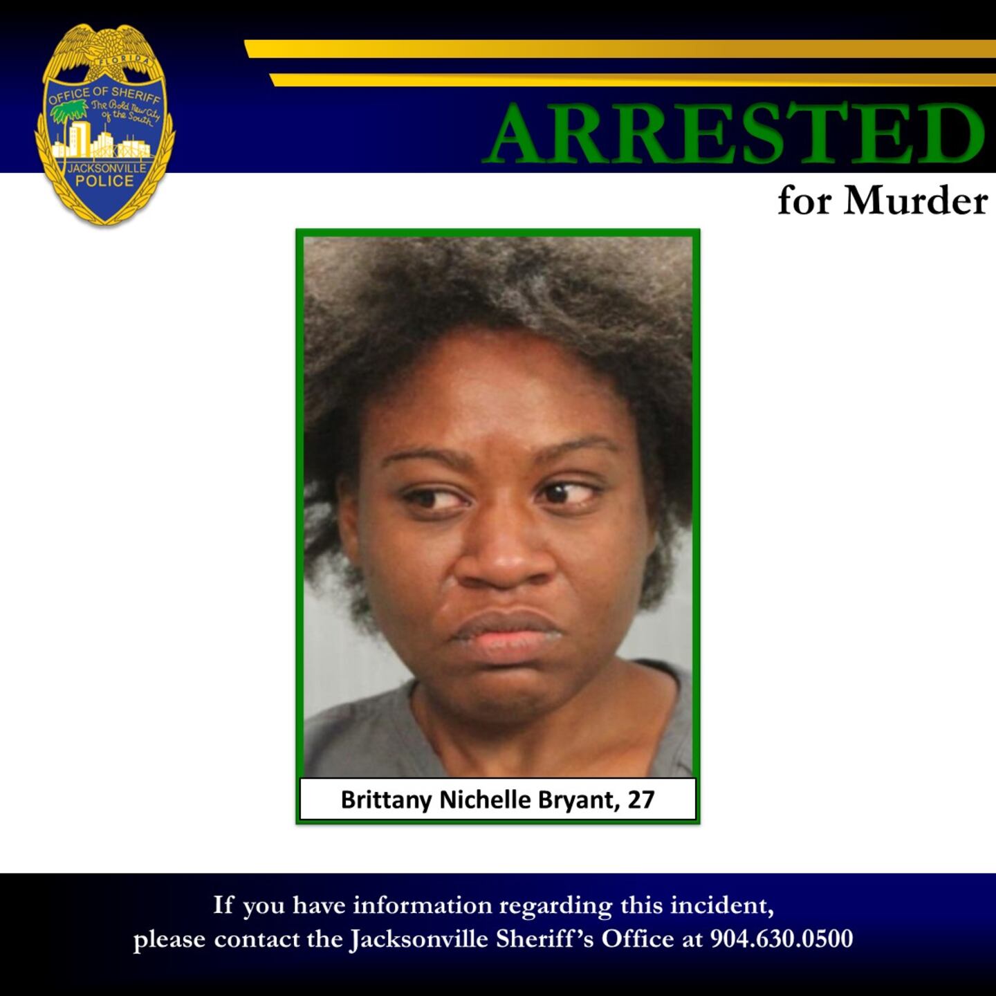 JACKSONVILLE, Fla. — Update: The Jacksonville Sheriff’s Office has announced today the arrest of 26-year-old Brittany Bryant charged with second-degree murder.