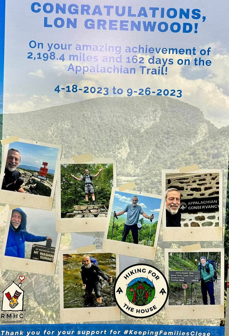 Lon Greenwood hiked the nearly 2,200 mile Appalachian trail from Georgia to Maine in less than 6 months to raise funds for the Ronald McDonald House of Jacksonville.