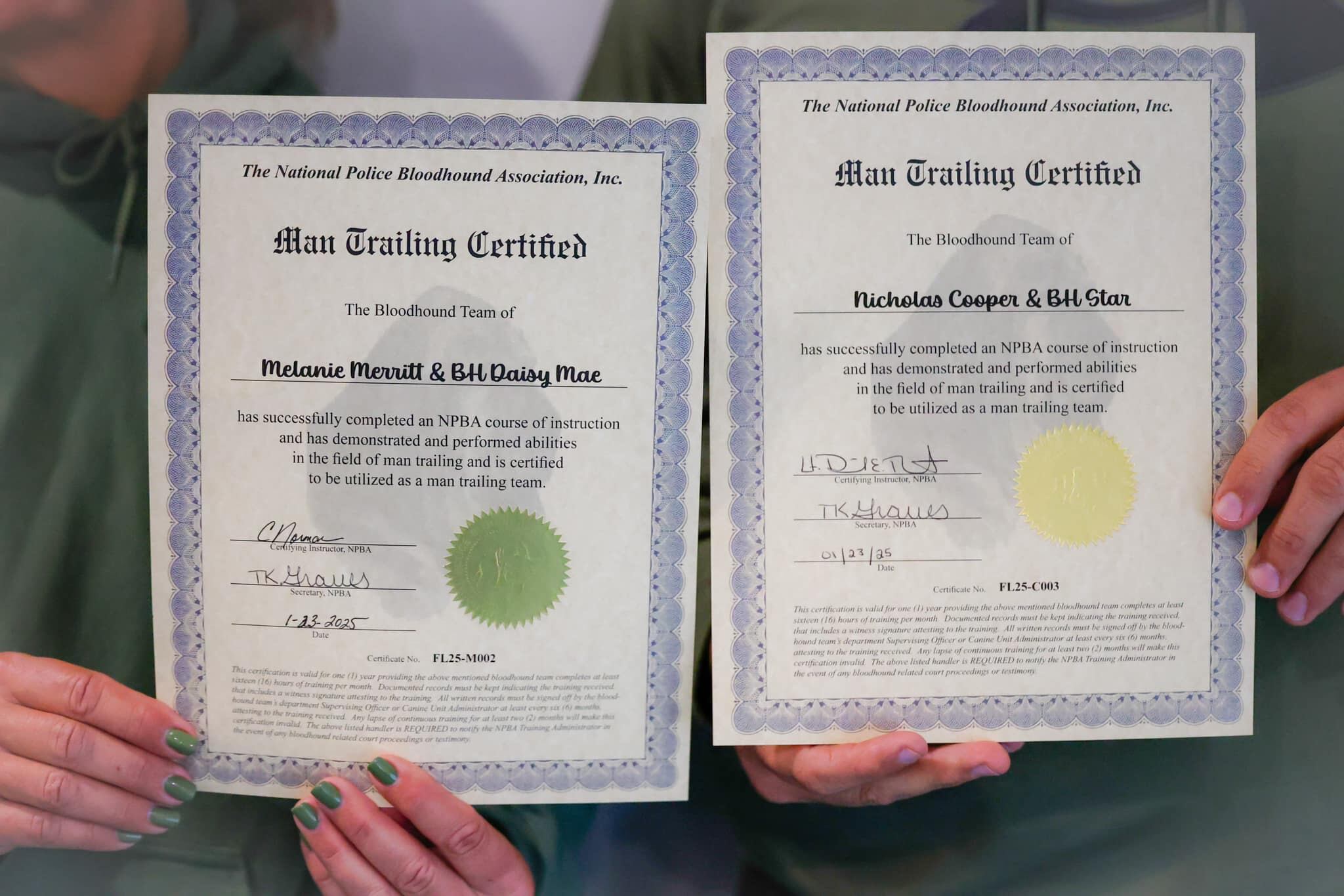Officers completed 40 hours of classroom and field training to improve public safety and law enforcement operations in their communities. Handlers were also evaluated in various terrain and aged trails to earn NPBA National Certification.