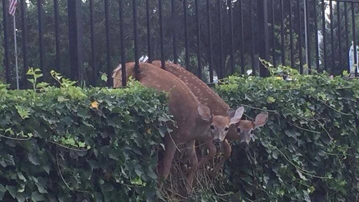 A photo shows the young deer stuck in a wrought-iron fence that surrounds the cemetery. Rangers say it appears that they were trying to get into the cemetery, but their back legs wouldn’t fit through the opening.